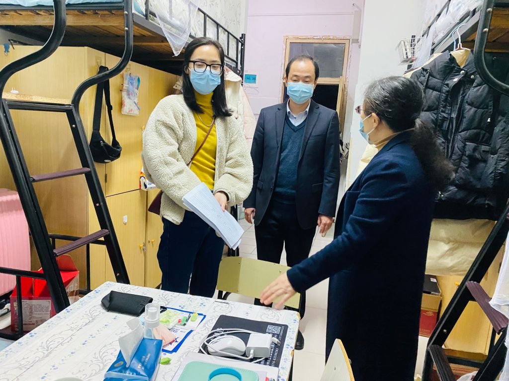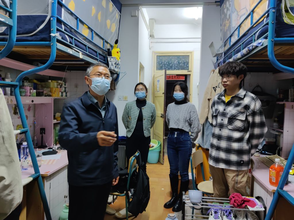 11月25日下午,党政领导带领全体专兼职辅导员深入学院实验楼、学生宿舍等教学生活场所,走访看望在校学生,了解学生最新思想动态,全面排查疫情防控、安全卫生等情况,重点检查了本科生、研究生的核酸检测、晨午晚检、健康打卡、安全签到等疫情防控要求落实情况,随机抽查了部分学生健康码、行程码,并叮嘱学生要牢固树立个人是疫情防控第一责任人的意识,理解支持属地和学校疫情防控政策。指导学生针对检查过程中发现的安全隐患,现场进行整改。
