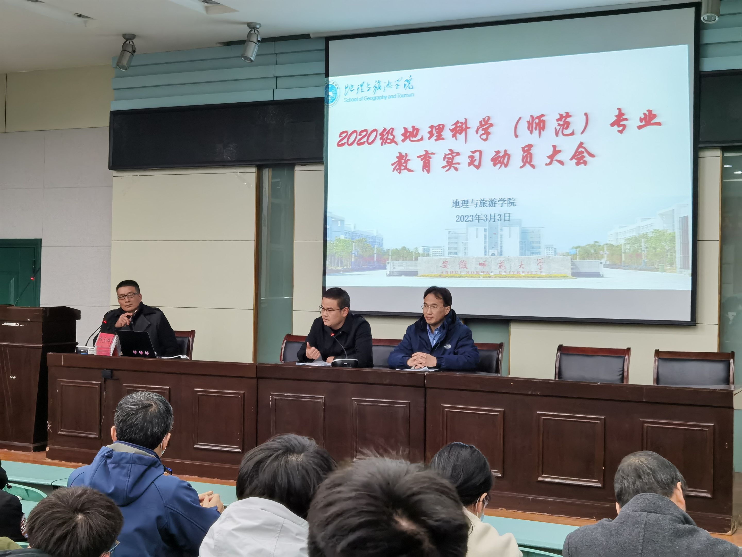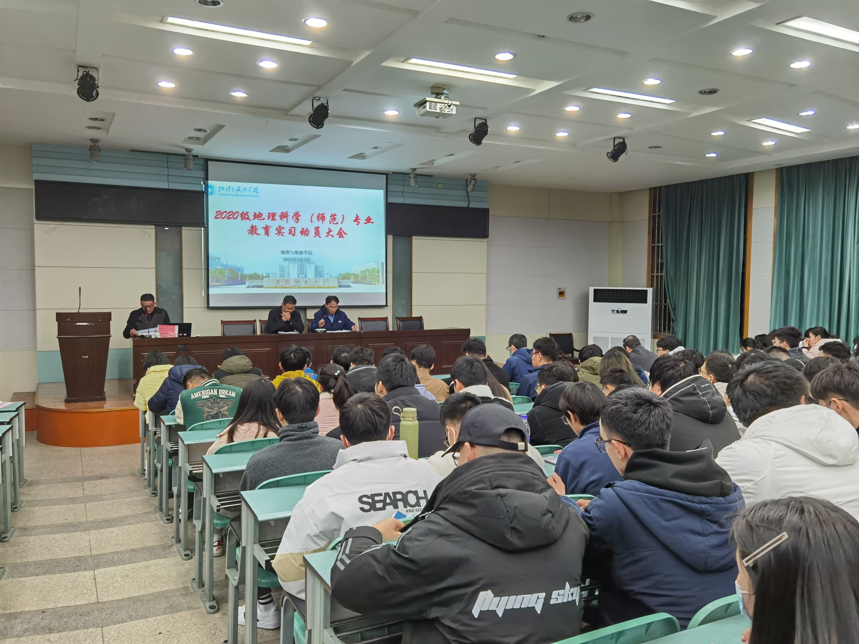 本网讯(刘思圻 彭媛媛)2023年3月3日,2020级地理科学(师范)专业在565net必赢客户端实验楼101报告厅召开教育实习/研习动员大会。大会由地理专业负责人朱永恒主持,565net必赢客户端党委副书记付勇、教学副院长杨兴柱出席会议,教育实习全体指导老师、辅导员彭媛媛、 2020级地理科学(师范)专业全体学生参加会议。