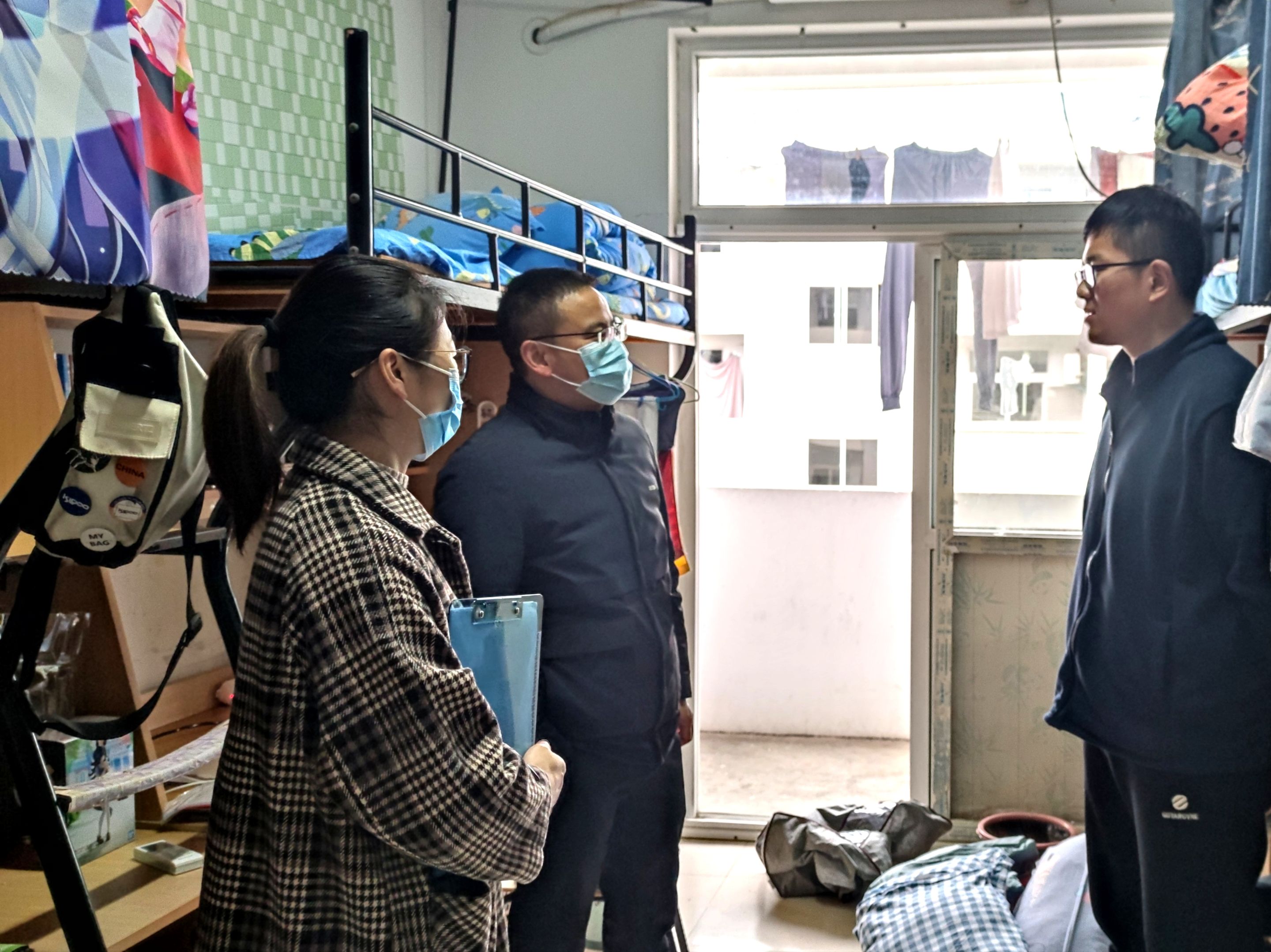 排查宿舍安全隐患。565net必赢客户端领导与辅导员深入学生宿舍一线,了解学生学习生活动态,细致排查宿舍安全隐患。建立“校-院-班”三级联动的寝室安全隐患排查机制,将学院每周三宿舍安全抽查与各班级每周宿舍安全突击自查相结合,对存在的安全隐患进行写实性通报并提出整改意见,班级督导整改。排查学生健康隐患。对患有基础疾病和身体出现异常学生精准梳理、建立档案、密切关注、跟踪关怀。
