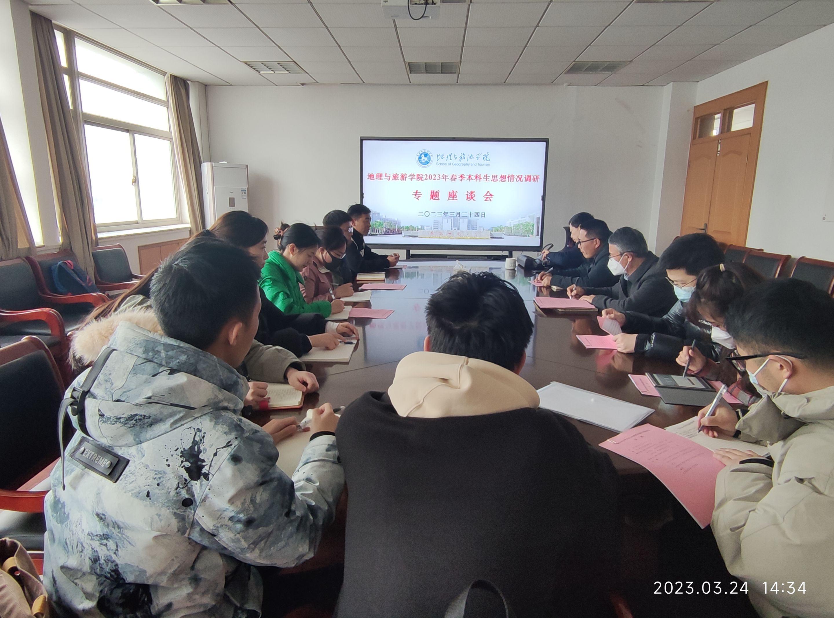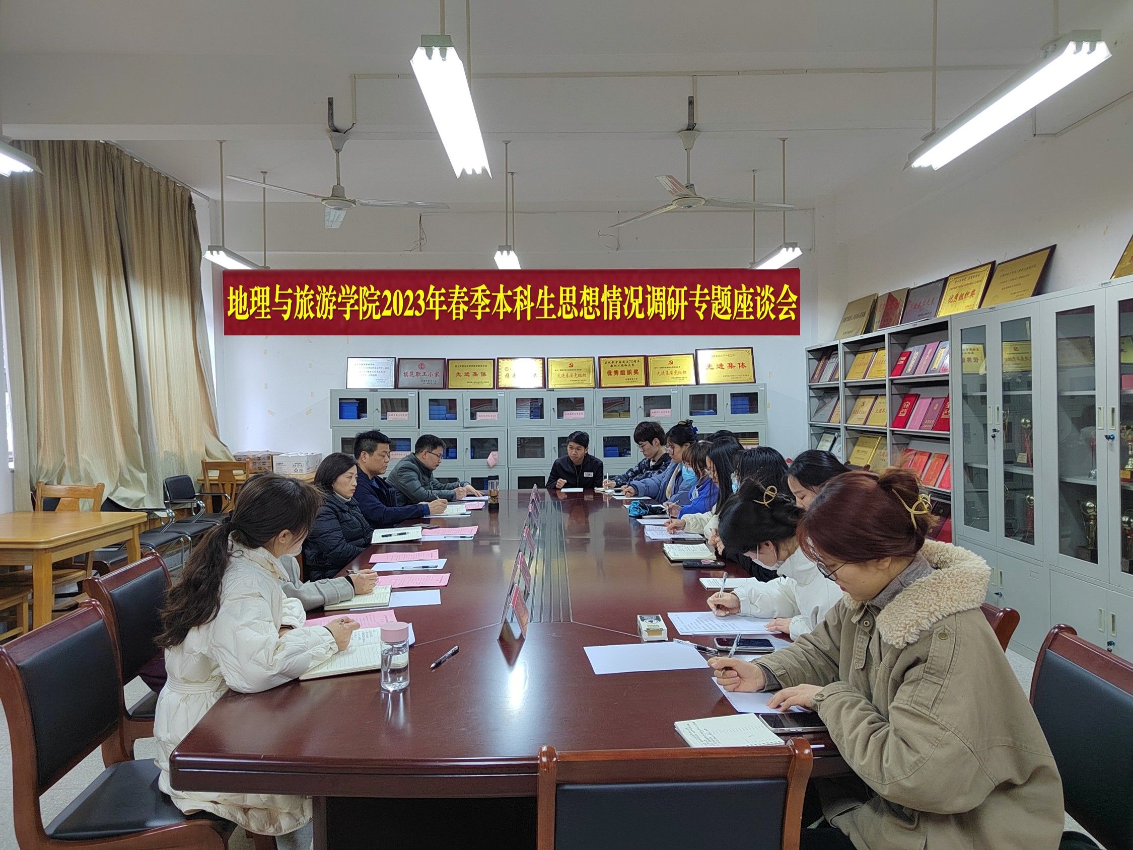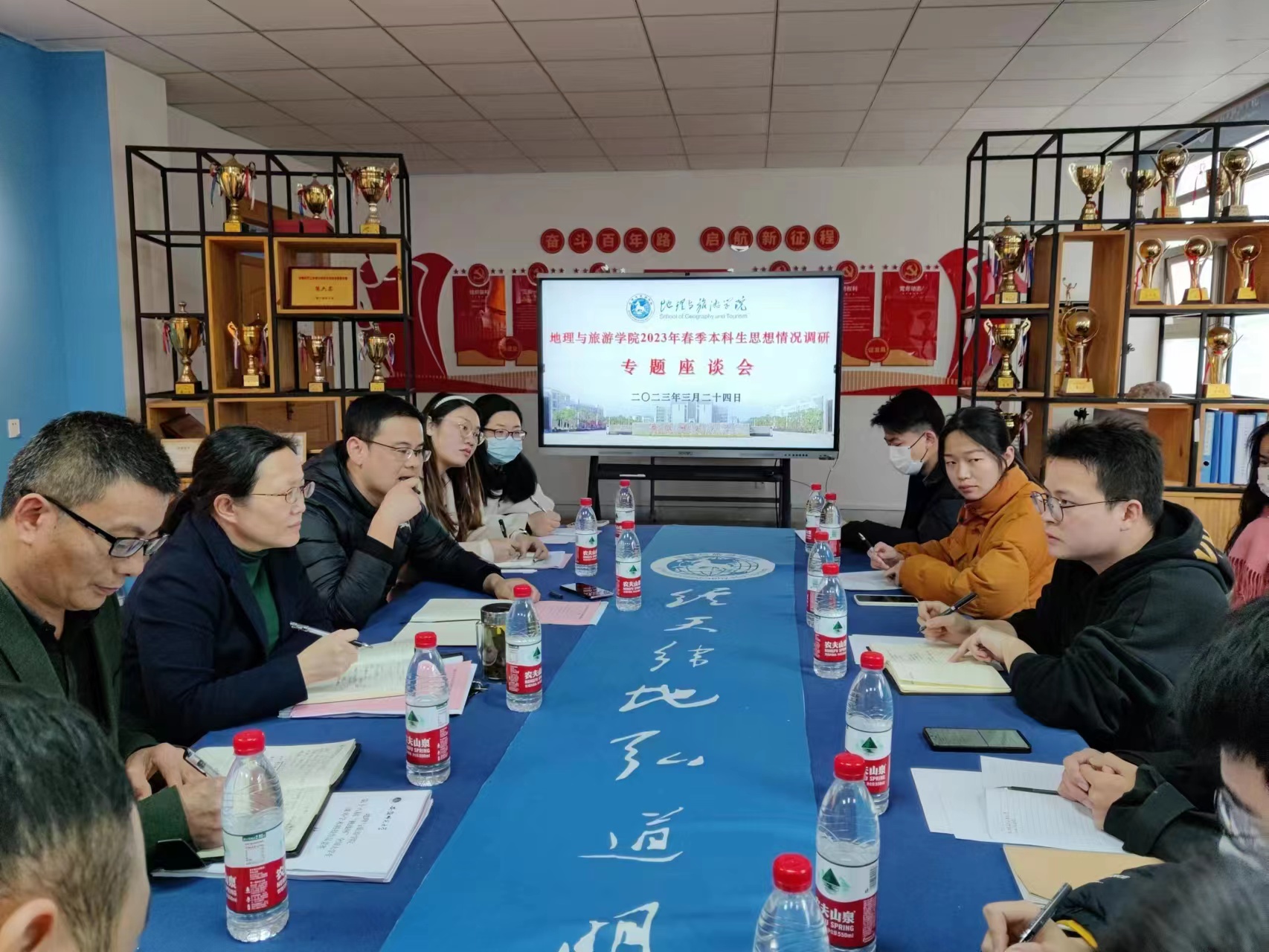 为及时了解春季学生思想状况,研究解决学生在思想、学习和生活等方面存在的实际问题,有针对性地做好教育管理和服务工作,不断满足学生成长诉求和实际需求,3月24日下午,565net必赢客户端在学院行政楼举行2023年春季本科生思想情况调研专题座谈会,座谈会根据专业划分为地理地信、土地城规、旅游酒店三个分会场。565net必赢客户端领导班子成员、各专业负责人、专业教师代表、专兼职辅导员以及学生代表按专业分会场参加座谈会。