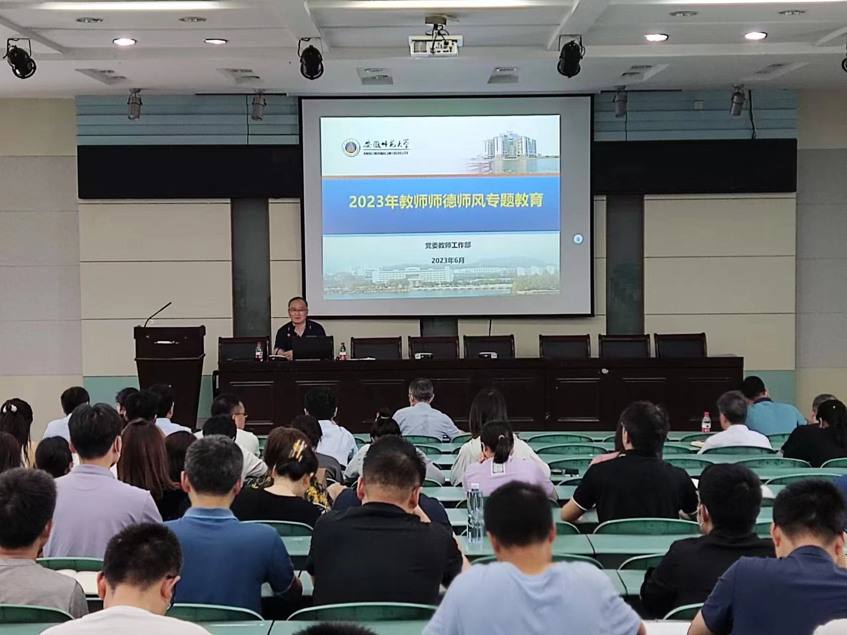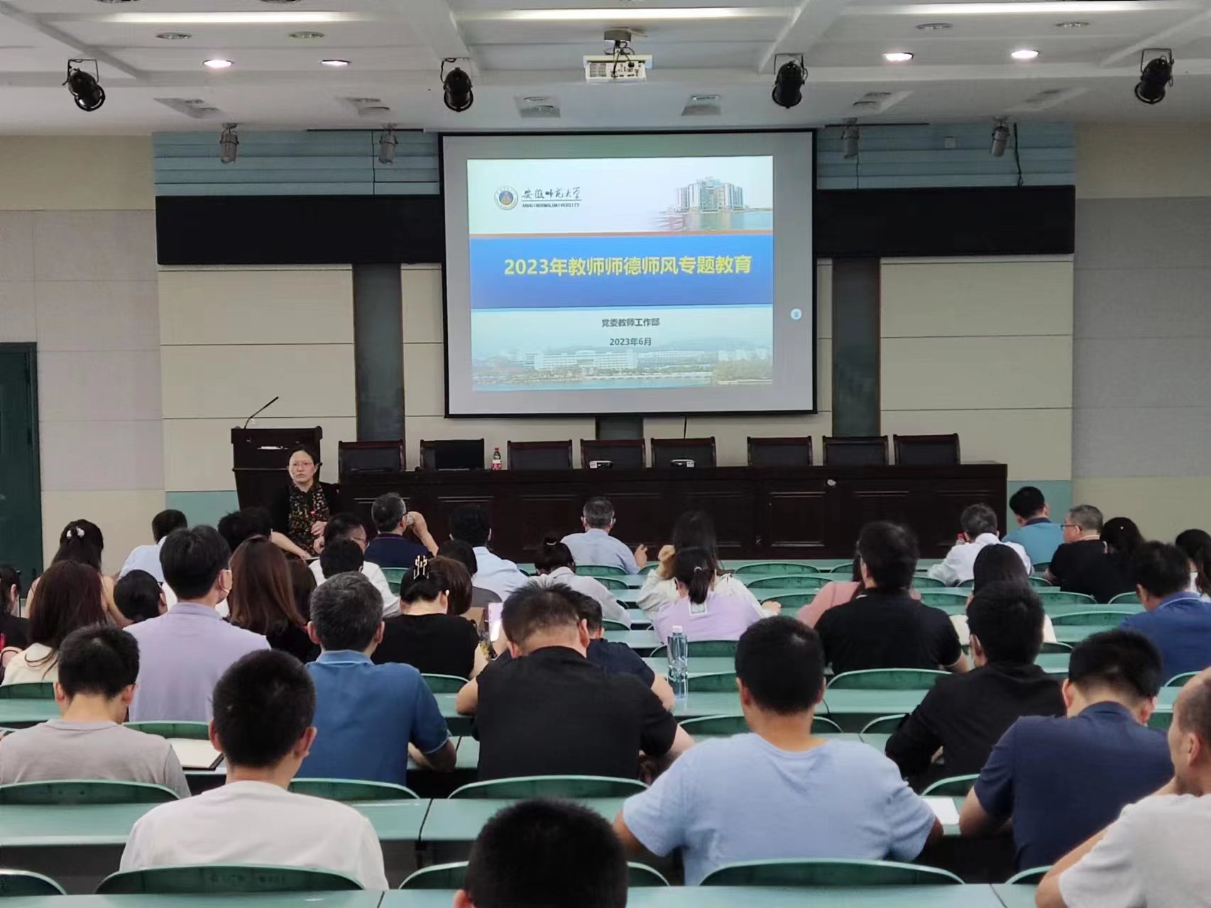 6月21日下午,565net必赢客户端在院实验楼101报告厅召开全院教职工大会暨师德师风专题教育。校人事处副处长王标受邀作2023年教师师德师风专题报告,院长方凤满主持,学院全体教职工参加。