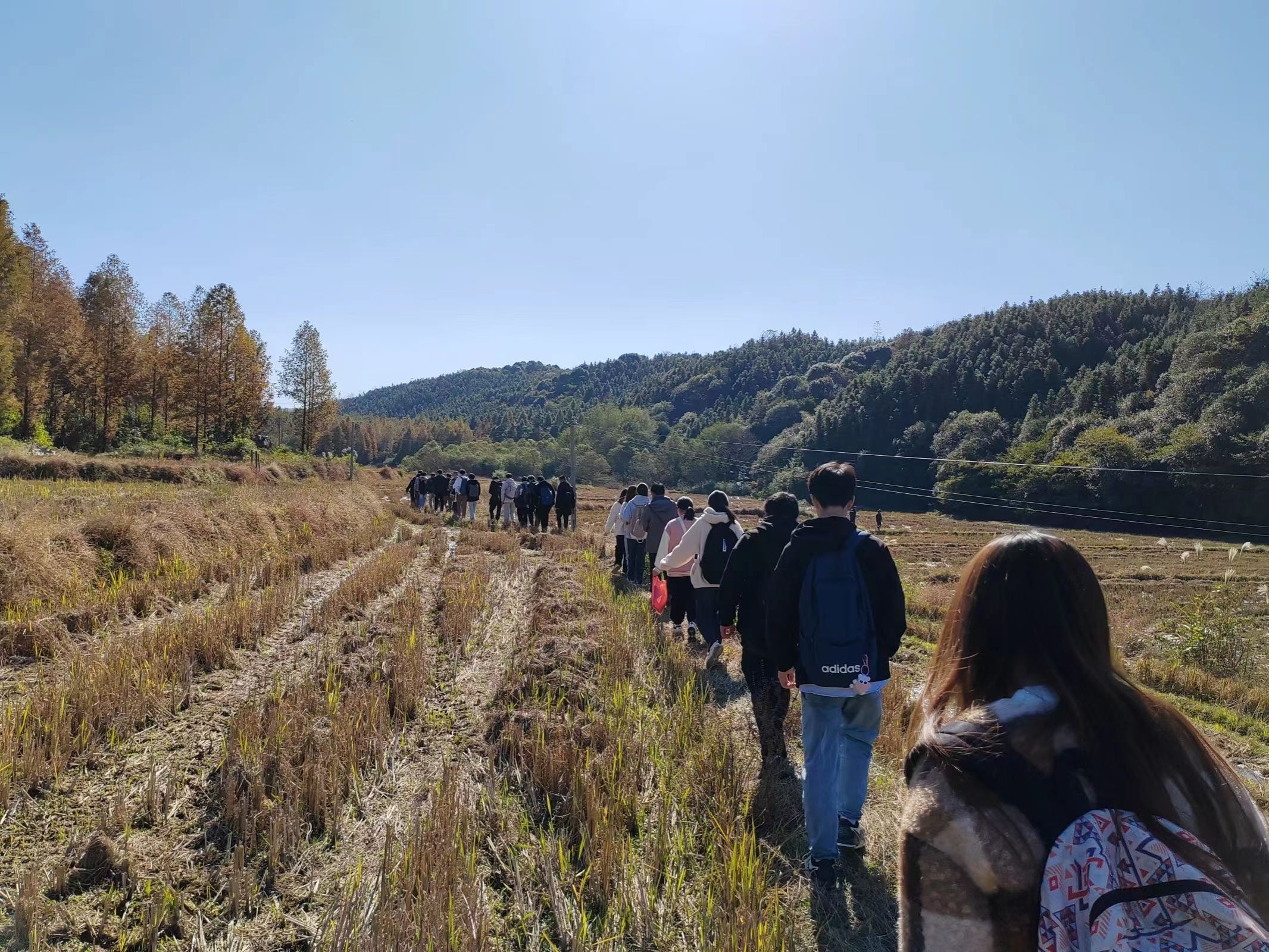 11月18日上午,实习队伍到达南陵县三里镇官田冲。三位教师带领同学们进行现场勘查,步行上冲,沿途为同学们讲解山冲地形地貌特征、土地类型、土地利用类型、土壤类型、水文及水利设施等。通过实地考查,同学们对山冲地形区土地构成要素的组成特点及规律有了进一步的理解。