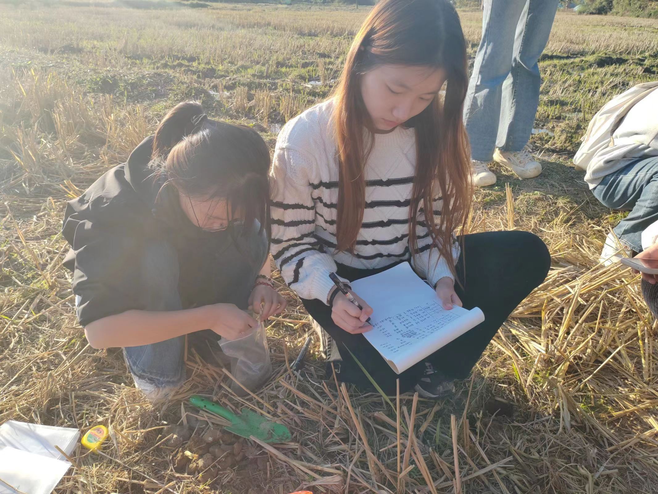 下午,全班分为四组,按组分别前往从冲头到冲尾划分的四个区域。各组成员分工合作,采集土样并记录数据。同学们按照余健老师教学的方法,独立观察得出结论,画出土壤剖面图及采样区域横断面图。调查期间,三位老师在旁指导,答疑解惑。