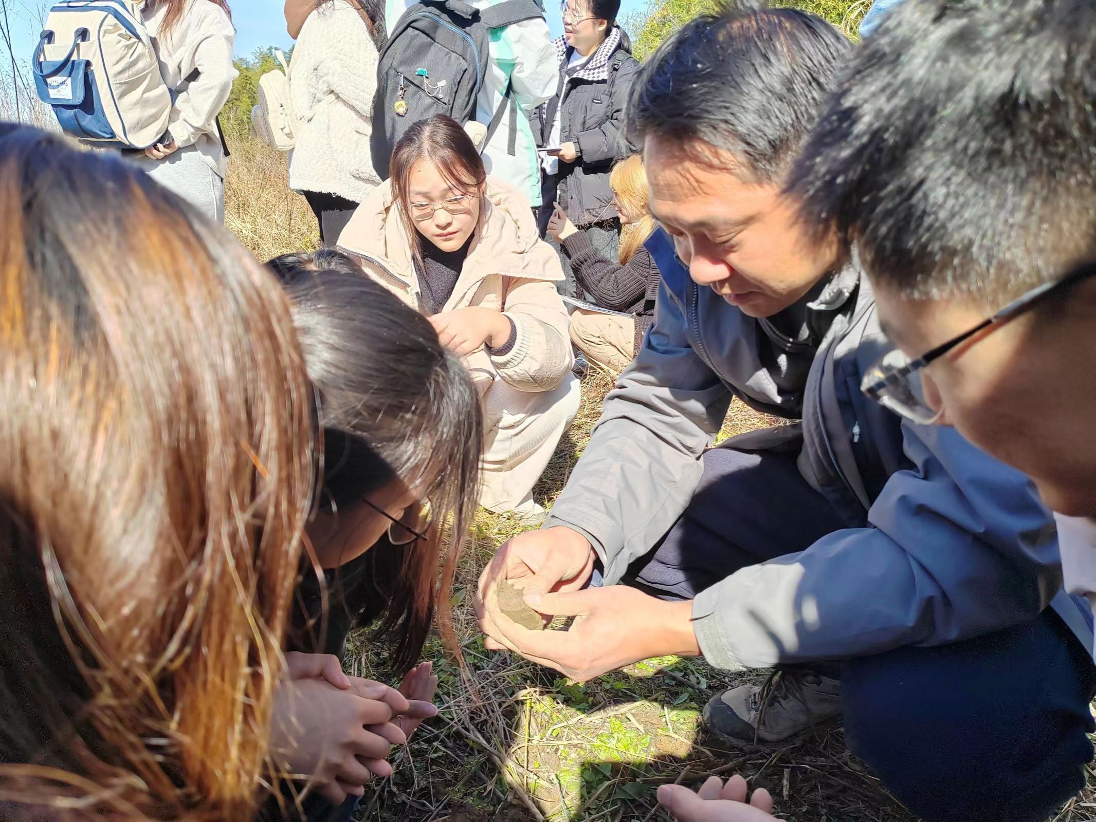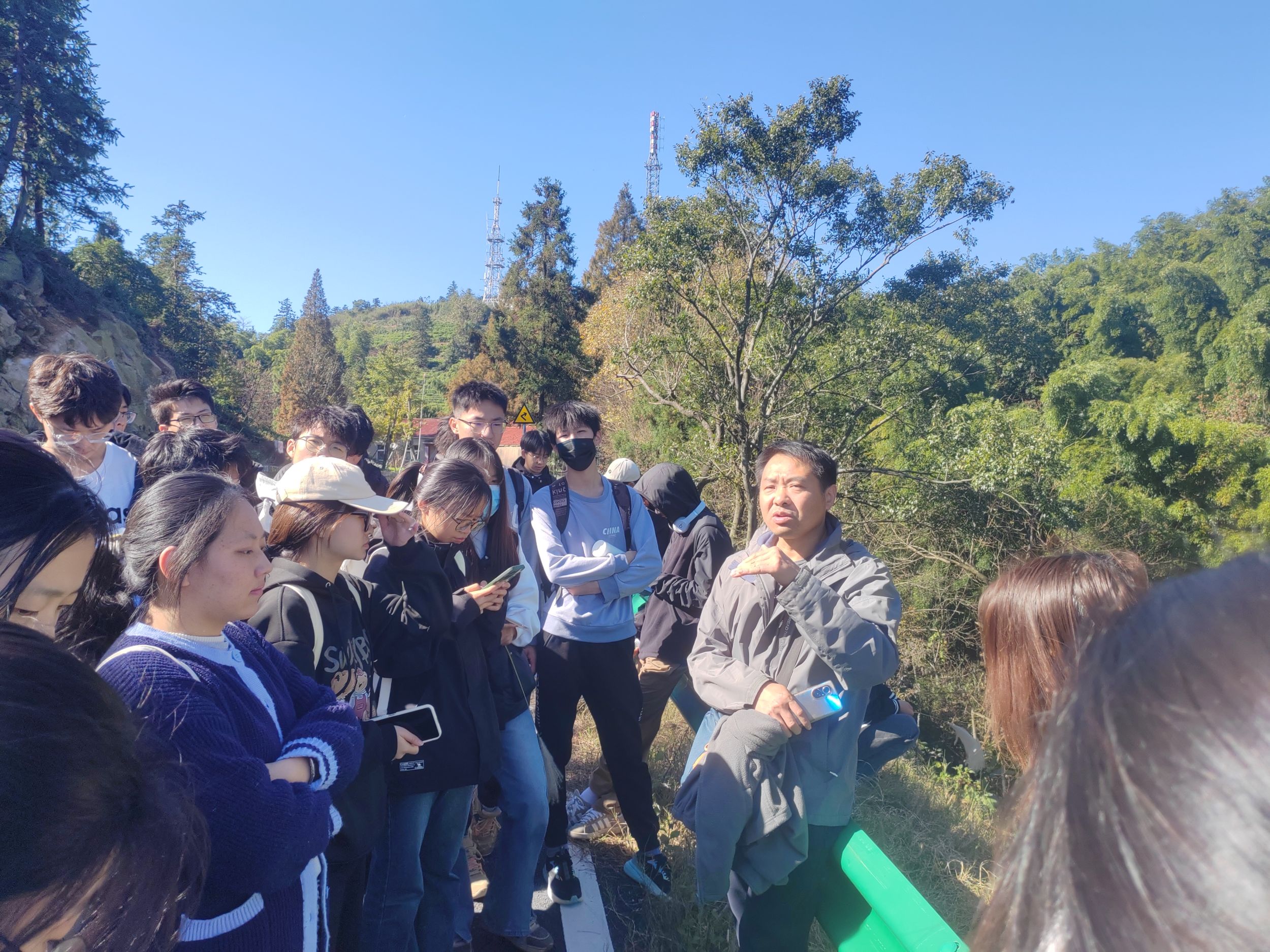 11月19日上午,实习队伍到达响水涧。登山途中,三位老师为同学们讲解了该区域山区岩层、岩性、土壤、植被分布、山麓圩田区水文水系等,同学们了解了该地区土地与地形、岩性、土壤、水文水系、植被等之间的关系。下午,实习队伍到达鸠兹湾。该区域为丘陵区,多为岗地,有特色的土地利用及开发。同学们积极讨论分析了丘陵岗地地区乡村环境整治与农业发展之间的关系。