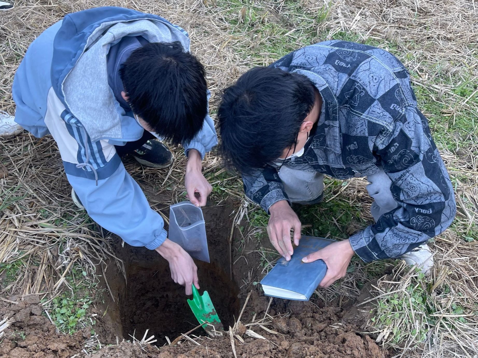 在余健老师的指导示范下,同学们在水田、水浇地等不同土地利用类型的土地上挖掘出50×50cm,深度60cm的土坑,观察裸露出的土壤剖面图。通过颜色和紧实度等土壤性状划分土层,并在采取土样后利用稀盐酸和邻菲罗啉等化学试剂辅助观察。观察完成后,同学们将土坑复原。