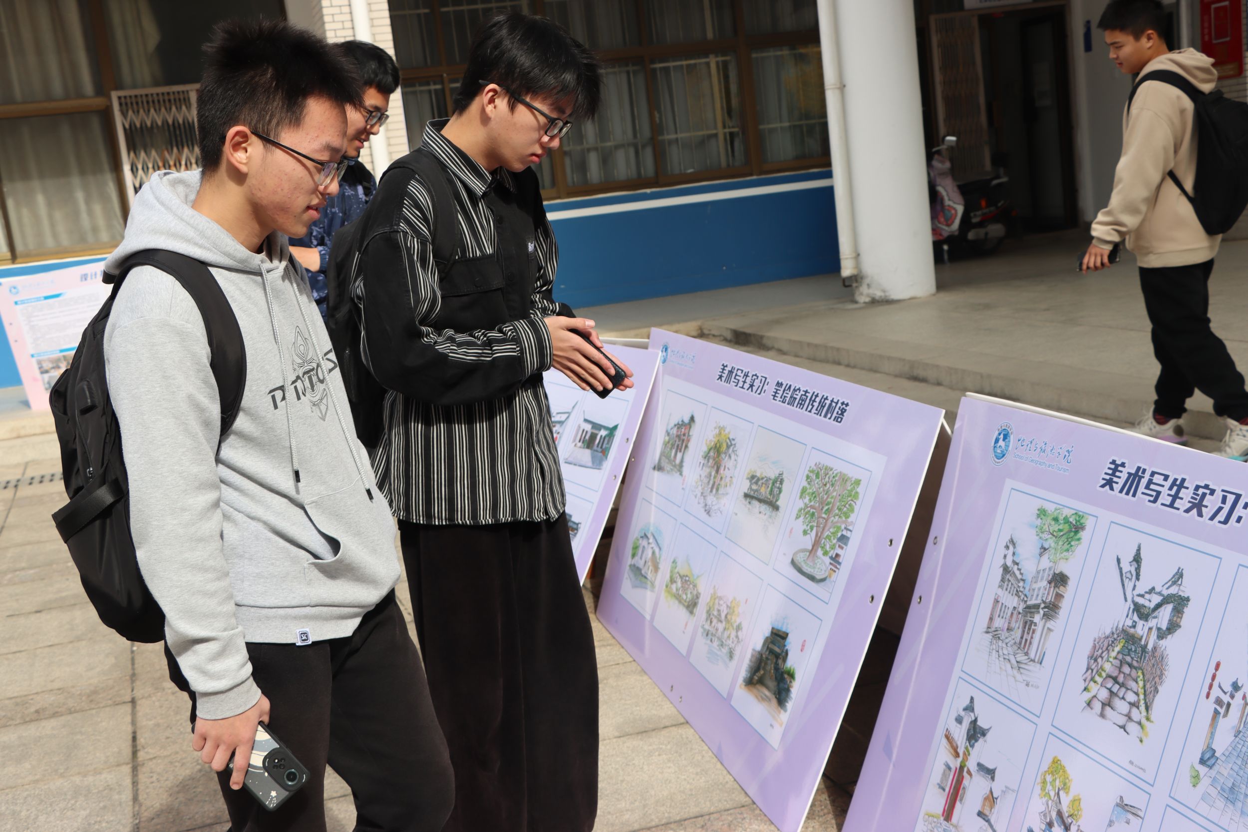 2022级城乡规划专业皖南写生实习优秀作品于11月22日在大学生活动中心展出,吸引各年级同学驻足观赏。从南湖到牛肠小巷,从湖边绿荷到粉墙黛瓦,从马头墙到木雕,或浓墨重彩,或清雅婉约,同学们用手中笔绘眼前景,一笔一画勾勒出青砖白瓦马头墙,使徽风徽韵具象化。