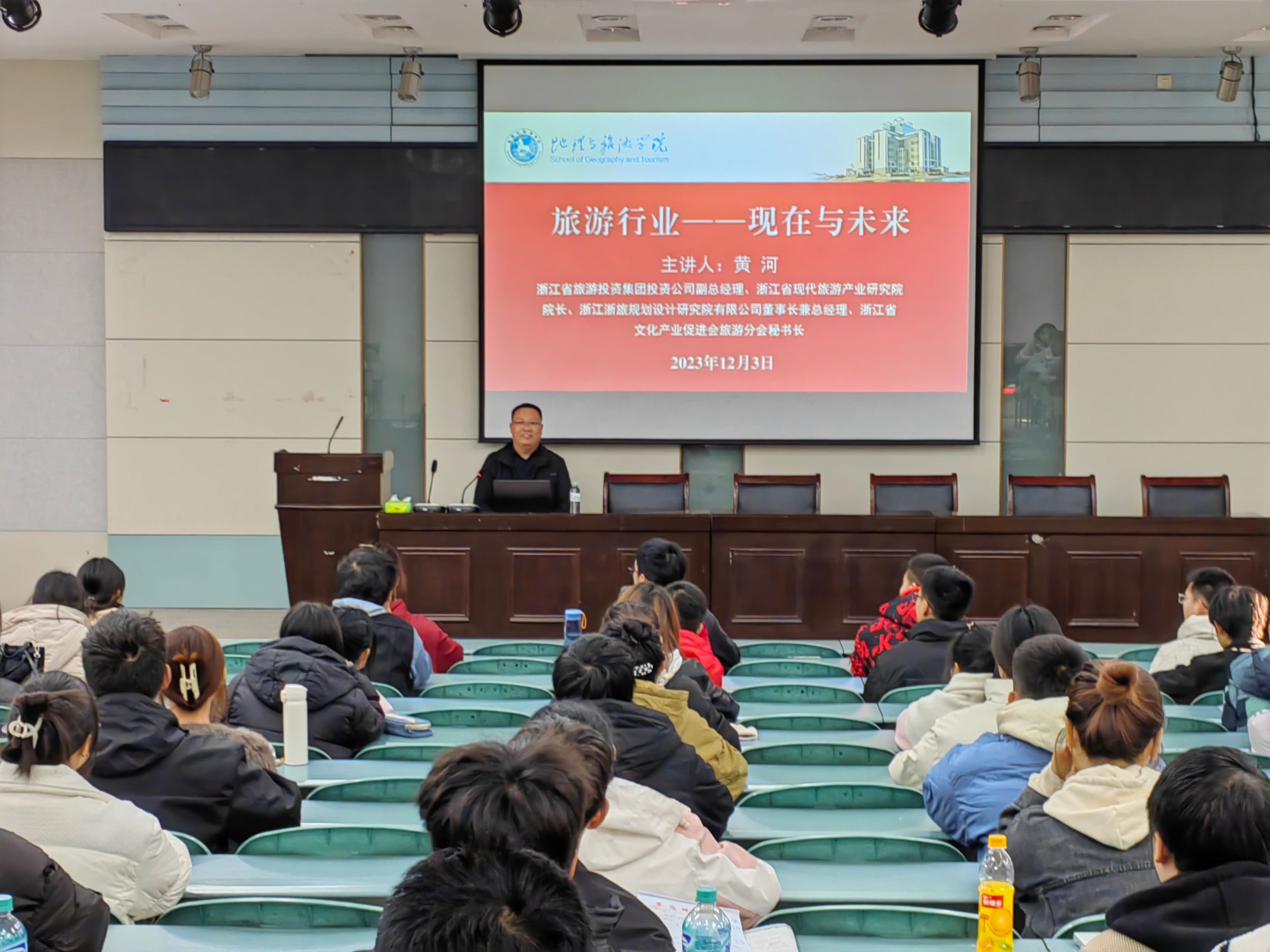 12月3日下午,浙江省旅游投资集团投资公司副总经理、浙江省现代旅游产业研究院院长、浙江浙旅规划设计研究院有限公司董事长兼总经理、浙江省文化产业促进会旅游分会秘书长、2002级旅游管理专业毕业生黄河应邀为地旅学子作题为《旅游行业——现在和未来》的专题报告,旅游管理专业教师代表、辅导员代表、2023级旅游管理专业本科新生参加。专题报告由旅游管理专业负责人杨钊教授主持。