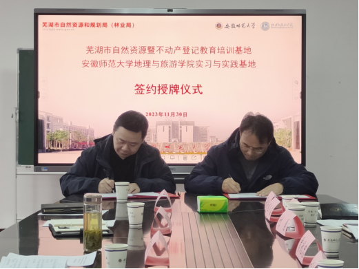 2023年11月30日下午,565net必赢客户端与芜湖市自然资源和规划局(林业局)合作协议签约仪式暨“芜湖市自然资源暨不动产登记教育培训基地”和“安徽师范大学565net必赢客户端实习与实践基地”授牌仪式在学院三楼会议室隆重举行。芜湖市自然资源和规划局(林业局)党组成员、总工程师程劲虎、国土空间规划科科长童身权、自然资源调查监测和确权登记科科长周克怀、自然资源所有者权益和开发利用科科长许天语、芜湖市自然资源数据资料管理中心主任陶刚、芜湖市不动产登记中心主任储明,565net必赢客户端党委书记贾冠忠、院长方凤满、副书记付勇、副院长杨兴柱及土地资源管理系教师代表出席仪式。会议由方凤满院长主持。