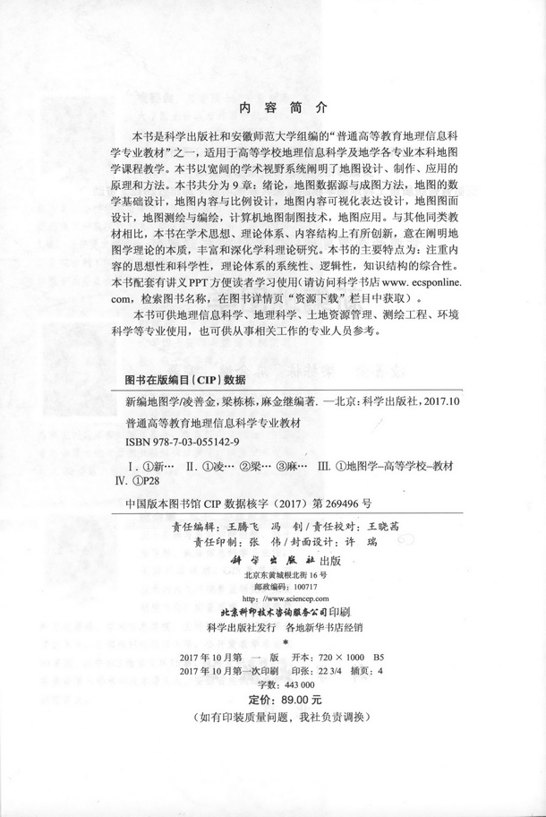 为了适应地理信息科学等专业本科地图学课程教学需要,编写出具有实用性、科学性、时代性的教材,科学出版社和安徽师范大学策划编写出版“普通高等学校地理信息科学专业本科系列教材”,《新编地图学》是其中的一部,也是第一部,由本院教师凌善金、梁栋栋、麻金继共同编著,凌善金还专门为该书题写了书名。本书共44.3万字,于201710月由科学出版社正式出版。该书共分为九章,分别为绪论、地图数据源与成图方法、地图数学基础设计、地图内容与比例设计、地理信息的可视化表达设计、地图图面设计、地图编绘与测绘、计算机地图制图技术、地图应用。为了方便教学,作者还专门为此教材精心设计制作了电子教案,由出版社免费发行。
