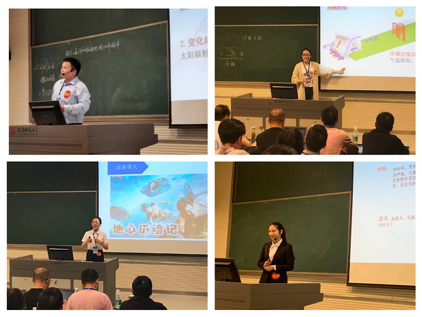 本次大赛分教学设计(含课件制作)、模拟上课和现场答辩三个环节。在模拟上课环节,来自阜阳师范大学的高龙睿同学创设“一粒沙子的独白——跟着沙子去旅游”的情境,在活动探究中调动学生积极思考;来自安徽师范大学的解维同学,由国庆长假天气预报导入冷锋及其危害,语言幽默生动,极具亲和力;来自宿州学院的袁聪同学以动图、视频、图片等多样化素材,借助自制简易学具生动形象地展示山地形成过程,逻辑严谨,思路清晰;来自皖西学院的潘生娓同学以天灾人祸问题导入,从水资源现状说起,层层递进,剖析人水问题,引人深思……场上的每位选手皆沉着应对,积极表现,整体体现了安徽省高校地理师范生良好的精神面貌、扎实的教学基本功和较高的教学水平。