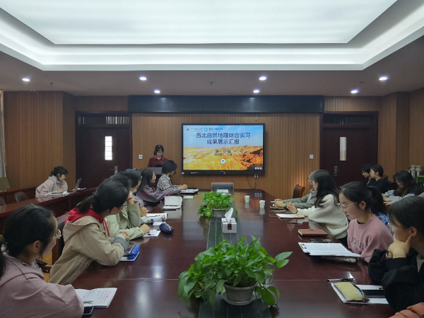 接着,各实习小组逐一对实习期的收获进行了总结汇报,从考察记录、问题思考、工作成果总结、心得体会等方面进行展示,介绍了西北地区自然环境概况与实习工作内容,分享了实习工作中的感受及其收获的进步和成长。此外,各小组还分享了对西北生态环境的认识和讨论、对班集体建设的感谢和建议以及对实习途中思政教育课的心得感悟。汇报内容丰富多彩、图文并茂,展示了实习团队良好的精神风貌。现场气氛活跃,掌声连连。