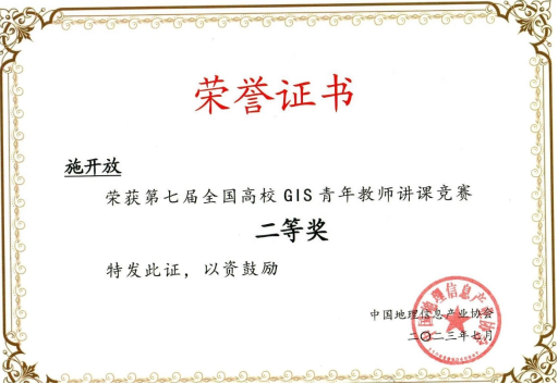2023年7月11—13日,由中国地理信息产业协会指导,河南大学主办,中国地理信息产业协会教育工作委员会等承办的第七届全国高校GIS青年教师讲课竞赛在河南大学举行。来自南京大学、武汉大学、华东师范大学、战略支援部队信息工程大学等全国80余所高校的GIS相关专业优秀青年教师参加了本次竞赛。竞赛采用现场教学与教学设计创新汇报两种方式进行教学演示。通过激烈的角逐,必赢青年教师施开放在此次竞赛中荣获二等奖。