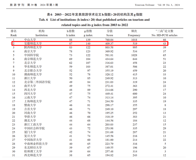 近日,中国旅游研究院旅游学术评价研究基地等的联名论文《2003—2022年我国旅游学术共同体学术成果评价》刊登在国内旅游研究权威性期刊《旅游学刊》2024年第3期。该文通过与旅游相关的50组检索词在中国知网中文核心期刊数据库、CSSCI数据库和CSCD数据库中检索出2003-2022年收录的旅游类学术期刊文章,经查重和筛选最终得到33106篇旅游学术论文,涉及1167种学术刊物、4727所机构以及29408名作者。该文分析发现,在旅游研究机构g指数和h指数的排行中,“中山大学h指数=88,位列第一;安徽师范大学h指数=87,屈居第二;而安徽师范大学g指数=140,名列榜首,中山大学g指数=139,屈居第二,这两所学校的h指数和g指数在伯仲之间。”同时,在作者的h指数和g指数排行中,我校陆林、王群、杨效忠、苏勤、杨兴柱5位老师入榜。该项研究表明我校旅游学术研究在全国具有较强的影响力。