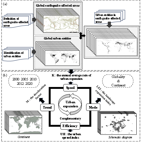 在全球地震频发背景下,及时且有效地评估震区(即地震潜在影响区域)城市扩张的时空模式,对于联合国可持续发展目标的实现具有重要的参考价值。夜光遥感技术依靠自身灯光信息,能够有效评估与解析全球城市—社会—经济的变化过程与空间模式。基于此,论文在提出一种全球夜光城市实体识别方法的基础上,构建了震区城市扩张集成分析框架,从多维角度对2000—2020年全球震区城市扩张的速度、趋势、效率和模式进行了量化与分析。研究结果可为全球震区城市可持续发展提供科学依据,对全球城市化进程的持续发展和战略推进具有重要的参考价值。