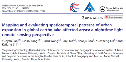 近日,565net必赢客户端2022级地理科学本科生潘悦妍在地球科学领域主流学术期刊《International Journal of Digital Earth》(中科院大类分区一区,期刊分类A5)发表论文“Mapping and evaluating spatiotemporal patterns of urban expansion in global earthquake-affected areas: A nighttime light remote sensing perspective”,有效剖析了近20年全球震区城市扩张的模式及其潜在影响。潘悦妍为论文的第一作者,施开放教授和林跃胜高级实验师为论文通讯作者。该研究得到了国家自然科学基金项目(42371249和42101345)、安徽省高等学校科研计划项目(2023AH020029)和安徽省大学生创新训练计划项目(202410370001)的共同资助。