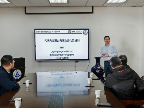 2024年12月14日上午,南京师范大学海洋科学与工程学院博士生导师杨阳教授应邀到必赢讲学,并做了题为《气候突变期台风活动变化及机制》的学术报告。报告在学院行政楼四楼会议室举行,学院相关专业的教师和研究生参加了此次报告。