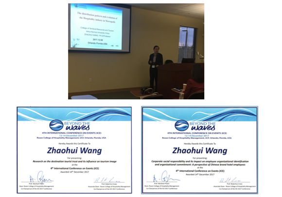 2017年12月7日—15日,必赢王朝辉教授研究团队应邀参加了“第二届中美旅游研究峰会”(2nd USA-China Tourism Research Summit and Industry Dialogue)和“第四届世界旅游与接待业研究峰会”(4th World Research Summit for Tourism and Hospitality)以及第四届国际事件会议(4th International Conference on Events),会议在美国佛罗里达州奥兰多市举行。