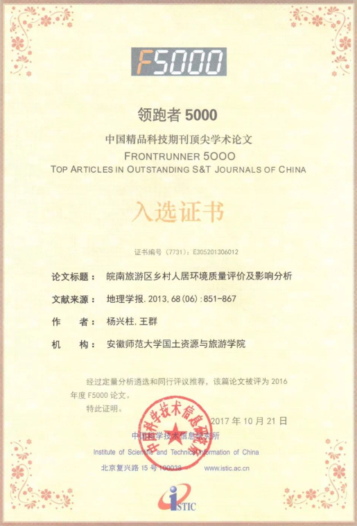 近日,中国科学技术信息研究所发布了2017年度“领跑者5000-中国精品科技期刊顶尖学术论文”(简称F5000)获奖名单,其中必赢杨兴柱、王群教授的科技论文获此殊荣。入选研究论文《皖南旅游区乡村人居环境质量评价及影响分析》于2013年发表在地理学科一级学报《地理学报》上。