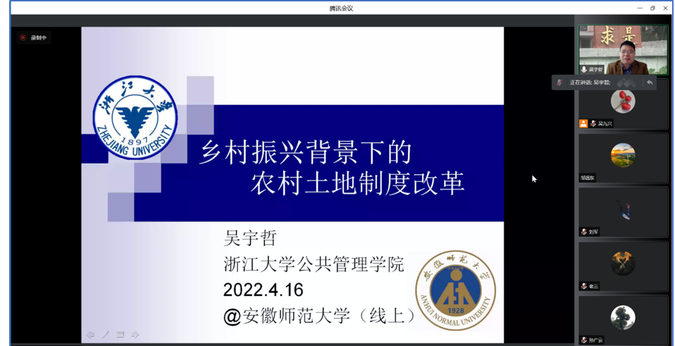 4月16日上午,浙江大学公共管理学院博士生导师吴宇哲教授应邀作了题为《乡村振兴背景下的农村土地制度改革》的线上学术讲座,学院相关专业教师和研究生在院三楼会议室通过视频连线的方式聆听了此次报告。