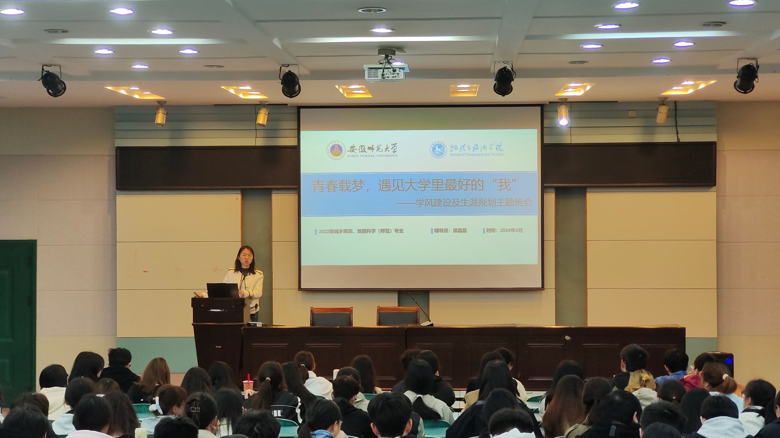 本网讯(王冰冰)为落实大学生护航行动计划,营造良好的班级学习氛围,增强大学生职业生涯规划意识,4月7日,2022级城乡规划、地理科学(师范)专业在实验楼101报告厅召开“青春载梦,遇见大学里最好的‘我’”——学风建设及生涯规划主题班会。班会由辅导员操晶晶主持,全体同学参加。