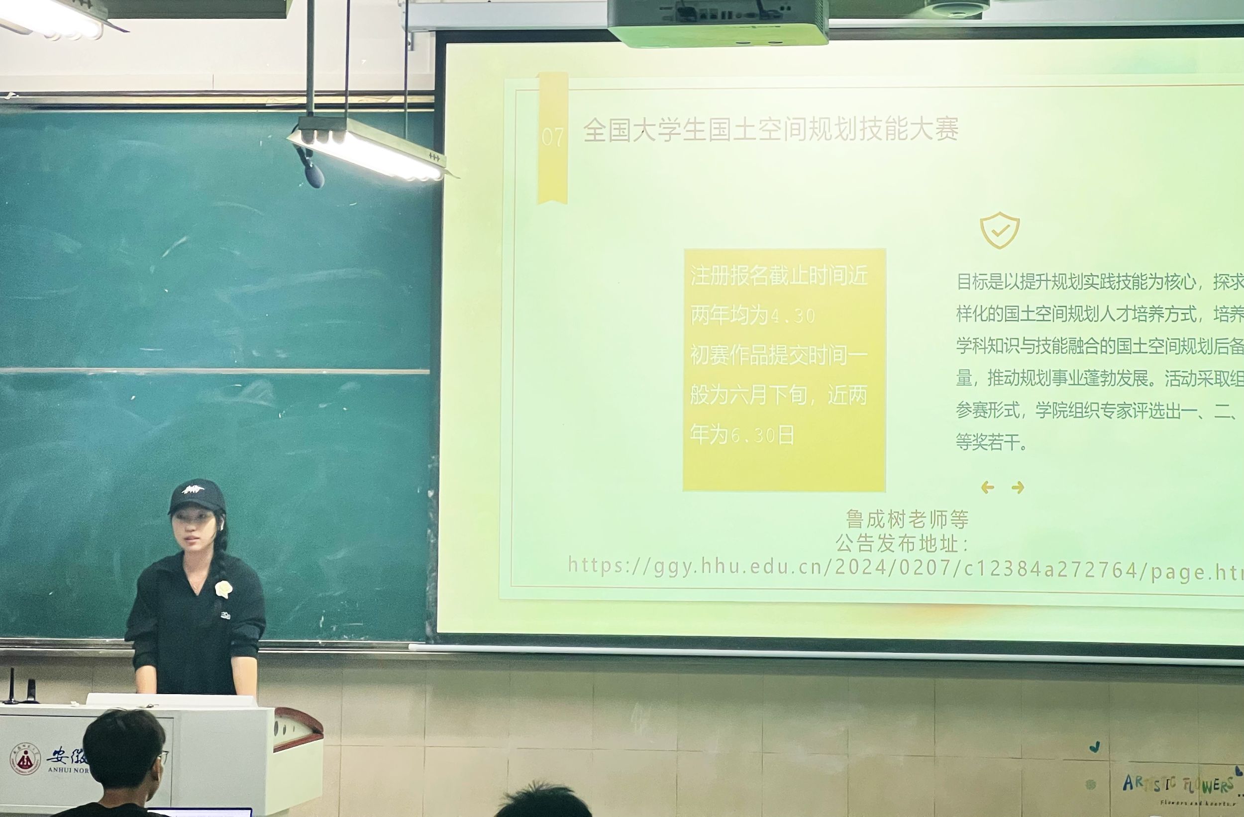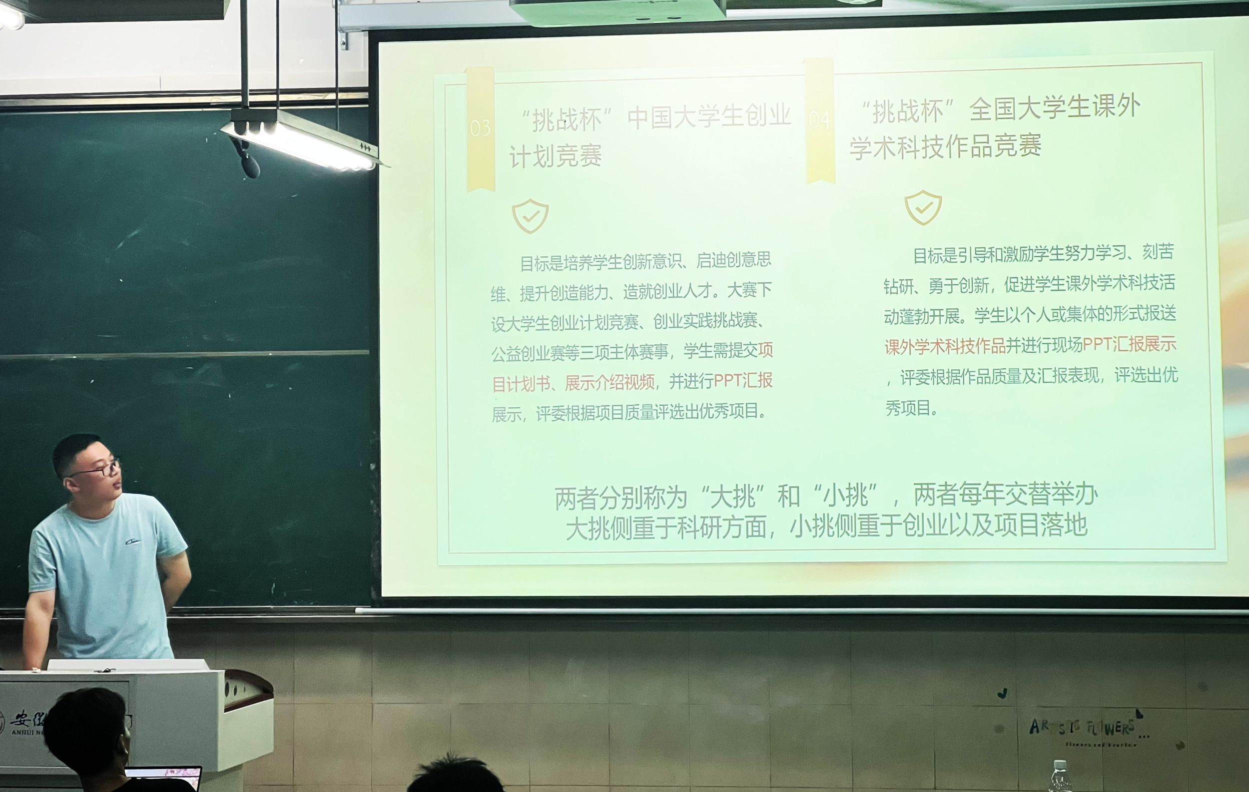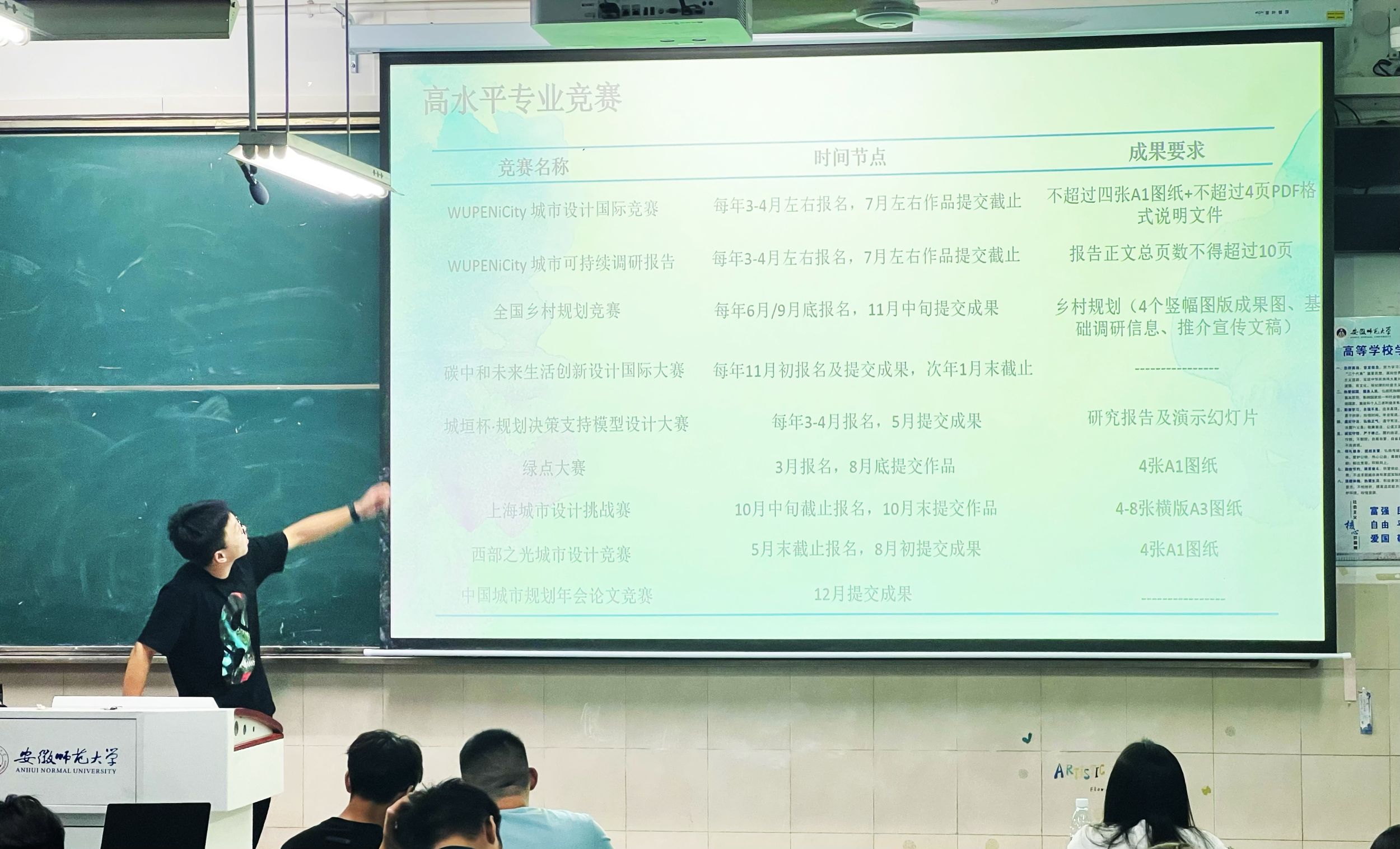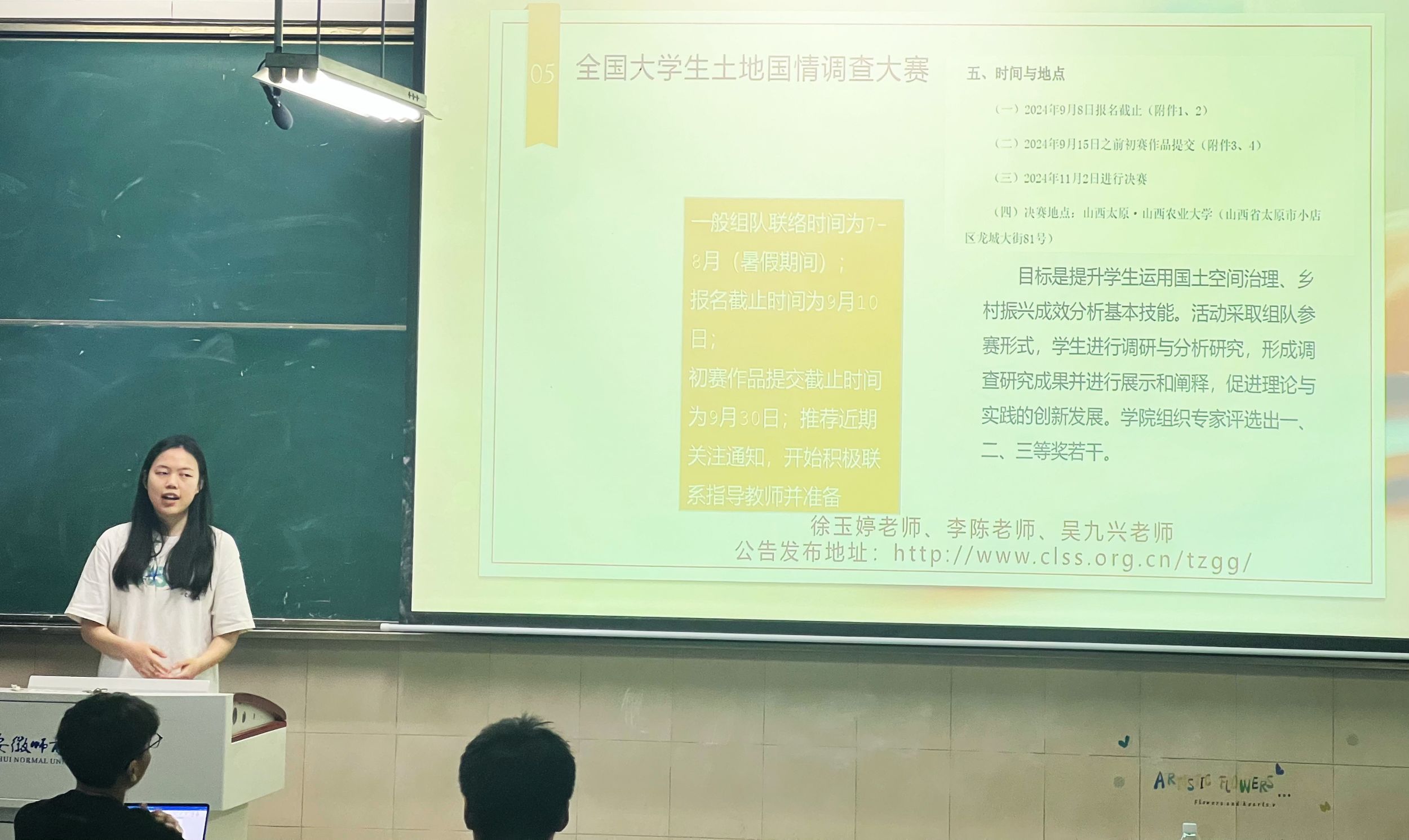 胡羽阳同学首先介绍了互联网+三创挑战杯等国家级权威赛事的内容、形式及参赛流程,正如古人云:会当凌绝顶,一览众山小。”,他鼓励大家要勇于尝试,不畏挑战。赖淑媛同学随后分享了自己在挑战杯、土地国情调查、不动产估价技能大赛等竞赛中的宝贵经验,提供了在时间管理、资料搜集和团队协作等方面的策略和技巧,她建议大家结合即将开展的暑期社会实践及下学期的相关课程,将成果认真打磨优化,与竞赛相结合,以赛促学,以学促赛。李诗毅同学则着重介绍了国土空间规划技能大赛,鼓励两个班级跨专业合作组队,通过知识融合、技能互补,充分发挥每个成员的专业优势,增强团队的综合竞争力。王冰冰同学就学科竞赛的重要性进行了阐述,参与学科竞赛不仅能够锻炼同学们的专业技能,而且能培养团队合作精神和解决问题的能力。李长乐同学则从挑选竞赛原则的角度,引导大家选择适合自己能力的竞赛项目。