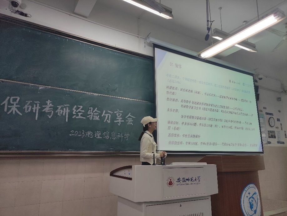 陆逸同学从思想、学业、学生工作和科研四个方面,为班级同学分享了自己成功保研南京师范大学的心路历程。在思想方面,她详细为同学们介绍了入党的基本流程,鼓励同学们积极参与志愿服务,增强社会责任感,向党组织靠拢。在学业方面,陆逸同学分享了自己的学习方法,并结合2023级地理信息科学专业的课程安排,针对期末课程复习提供了具体建议。她强调同学们应该重视专业课程的学习,可以通过制作思维导图等方式提高复习效率,提升学业成绩,为保研打下坚实基础。学生工作方面,陆逸同学鼓励班级同学积极担任班级和学院学生干部的工作,提升自己的社会实践能力。在科研方面,她强调了本科生进实验室的重要性,鼓励同学们多与导师联系,积极参加各类竞赛,为保研增加更多优势条件。