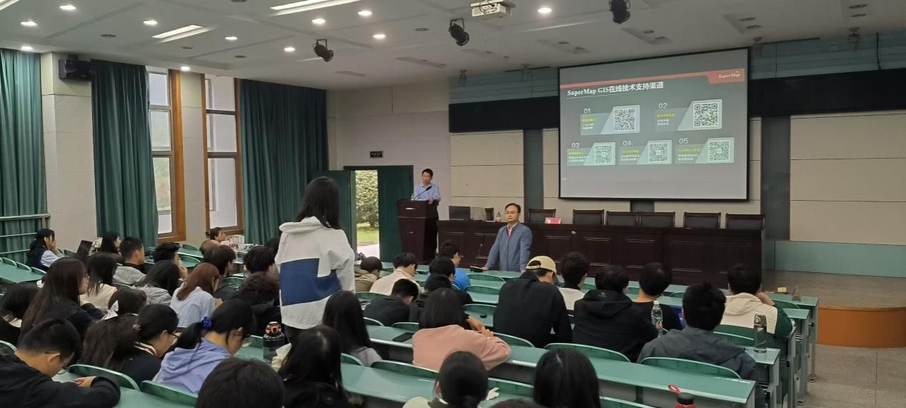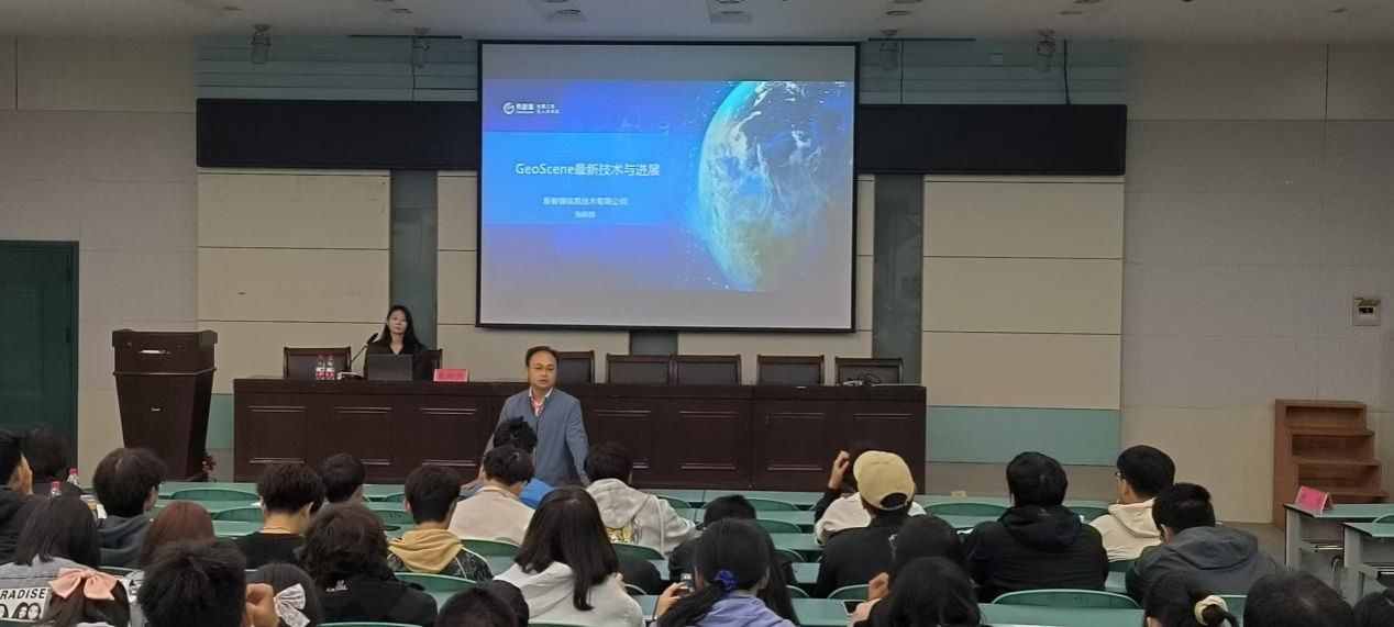 陈勇为24级新生带来题为《空间智能软件技术创新与应用》的讲座,他向同学们展示了GIS的内涵和作用,分别讲述了空间智能软件六大体系,地理信息科学到空间智能软件的解读。他说到,地理信息的魅力是我们通过挖掘数据发现空间分布的规律。张妍然为同学们讲解《GeoScene最新技术与进展》随后展开了技术专题的讲解,讲述了其产品体系,传统GIS向自动化发展的过程,她提到未来GIS软件的开发将会朝着“零代码”的方向发展。