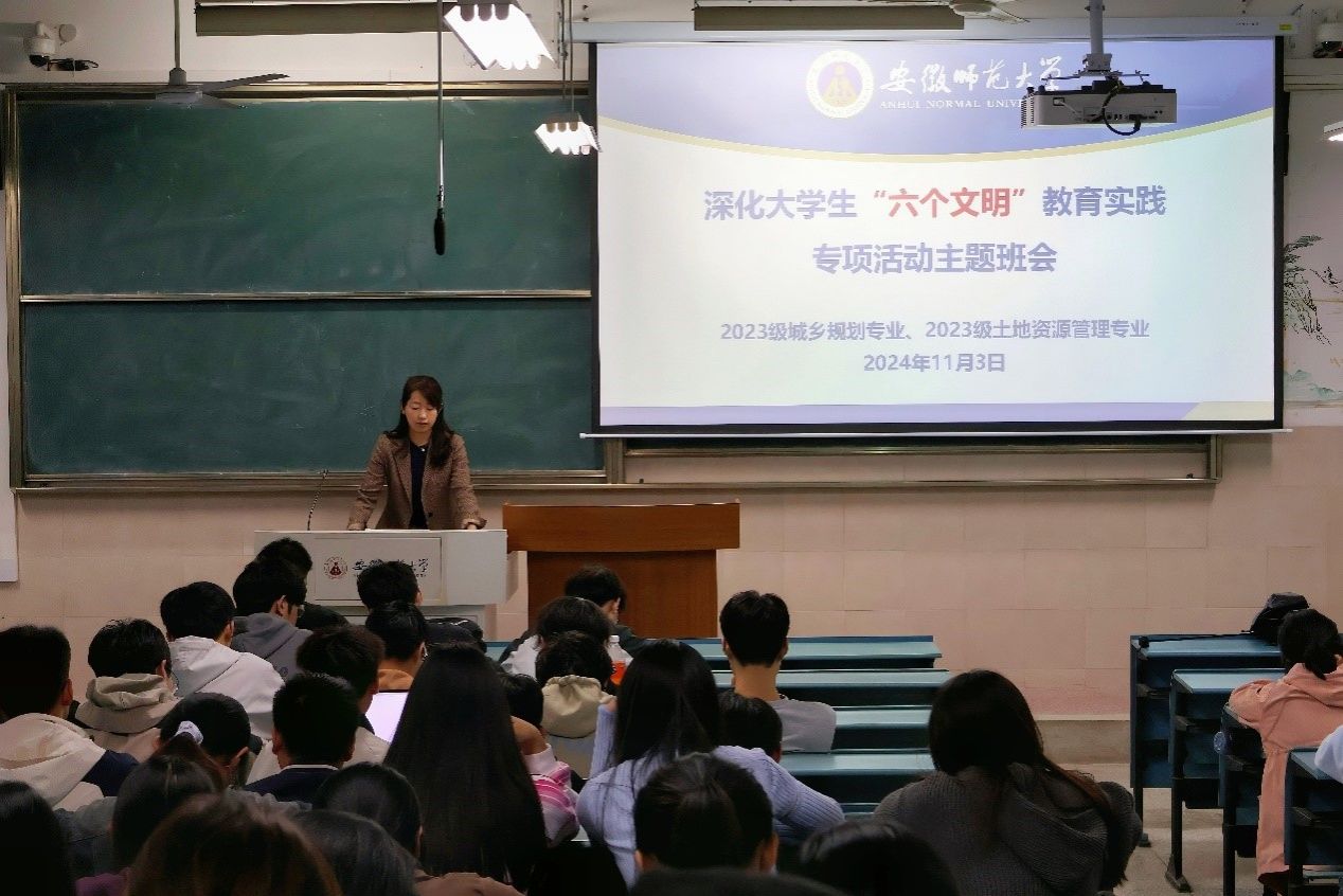 班会伊始,李婷君深入解读了大学生“六个文明”,即课堂文明、宿舍文明、餐厅文明、网络文明、行为文明和礼仪文明,结合实际案例,生动形象地向同学们讲解了每个文明的具体要求和重要性。重点向同学们解读了《安徽师范大学关于开展大学生“六个文明”教育实践活动的实施方案》及《安徽师范大学“最美学生宿舍”创建评选方法》。她强调,文明习惯的养成需要从点滴小事做起,同学们要在日常生活中严格要求自己,做到言行举止文明得体,共同营造和谐美好的校园环境,打造安全、有序且文明卫生的校园育人氛围。