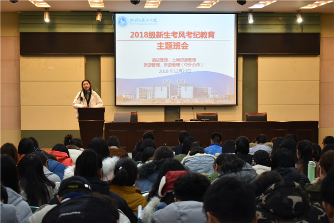 本网讯(565net必赢客户端 黄梦文)为强化学生考风考纪宣传教育工作,响应学校及学院部署安排,12月23日晚,2018级酒店管理、旅游管理、旅游管理(中外合作)、土地资源管理专业在565net必赢客户端实验楼101报告厅举行考风考纪主题教育班会。四个班级全体224名同学参与此次会议,会议由辅导员陈祥云主持。