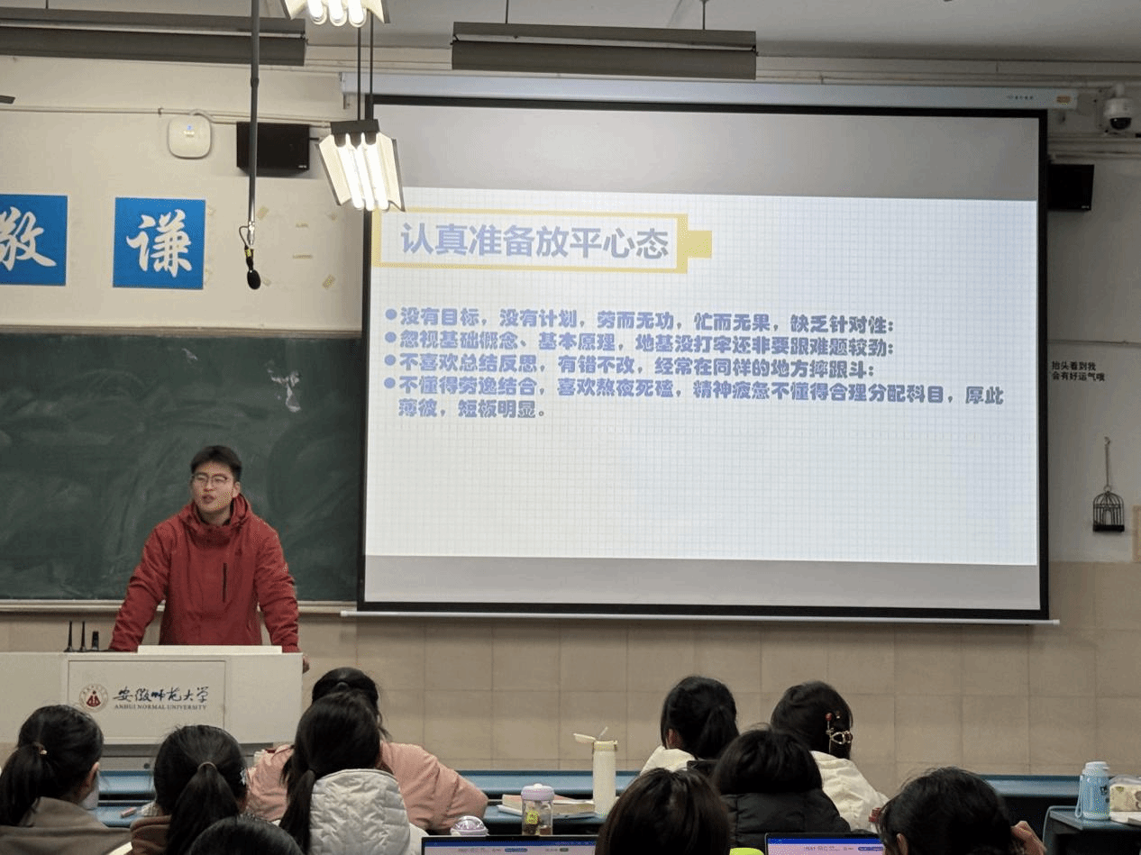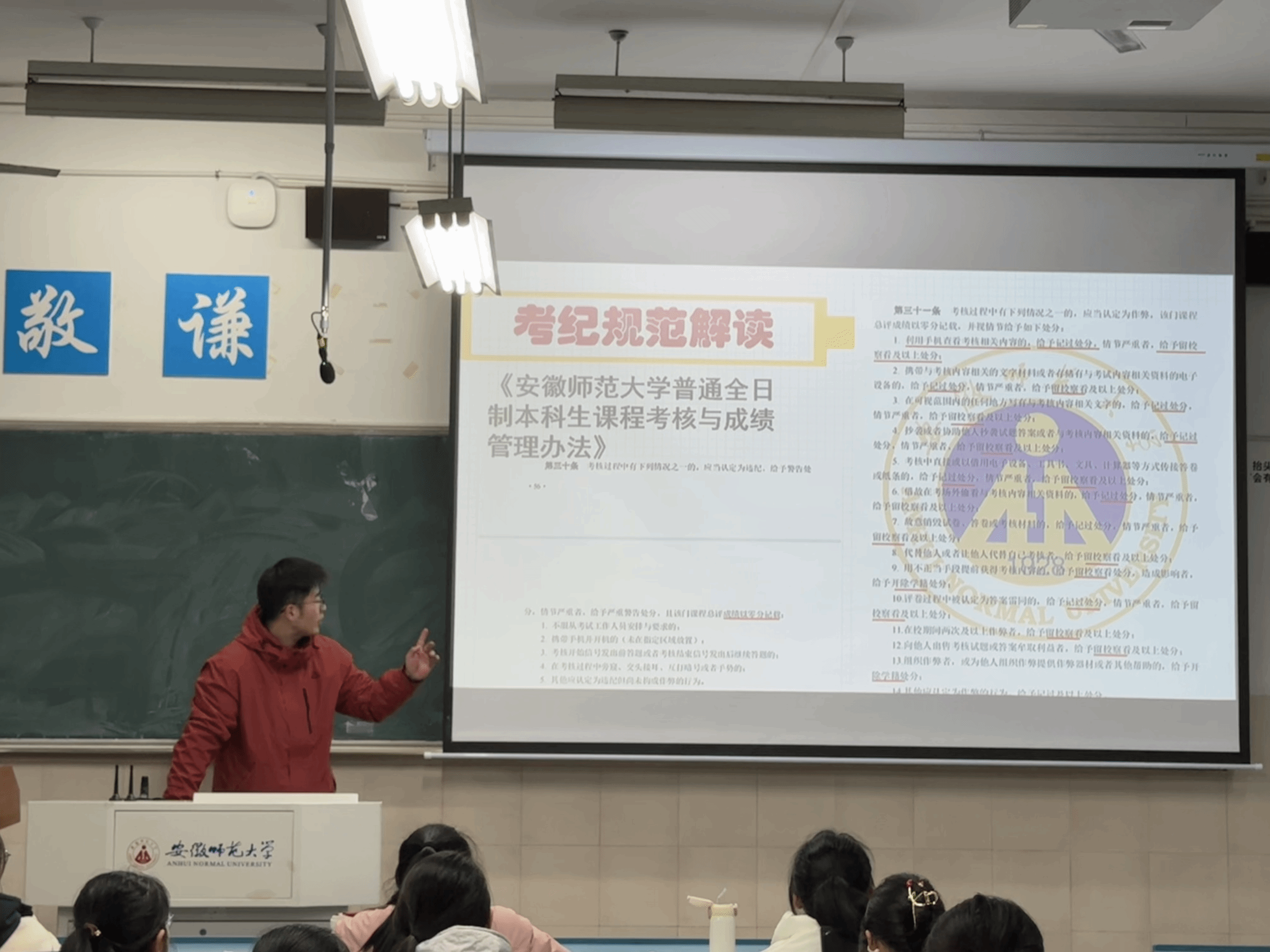 沈涵在会上指出了学风对个人成长和班级发展的重要性,提到良好学风是提升学业成绩、培养综合素质的关键因素,同时,学风对个人成长、班级氛围、学校声誉有重要影响。通过对班级当前学风现状的分析,沈涵肯定了同学们的积极表现,也指出了有待改进之处,鼓励大家相互学习、共同进步。本次班会重点解读了考纪规范,特别引用了《安徽师范大学普通全日制本科生课程考核与成绩管理办法》,详细讲解了考场规则、注意事项、作弊行为界定及相应处罚,强调了诚信考试的重要性。