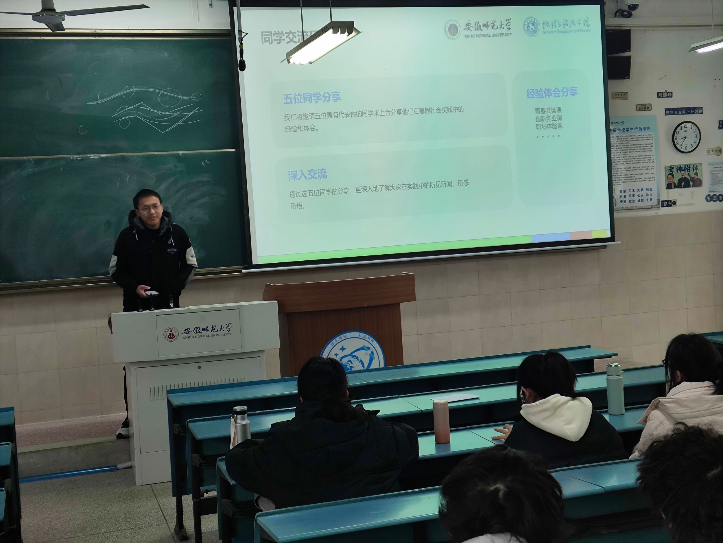 据分享会介绍,寒假期间全班同学参与率达100%,累计提交超110份实践素材,涵盖志愿服务、职场体验、社会观察、创新创业等多个领域。其中,“青春创作课”以34人参与的热度成为最受欢迎实践课程。活动现场展示了丰富的照片、视频、调研报告及实践日志,生动记录了同学们在岗位实习、文化传承、科研探索中的点滴成长。