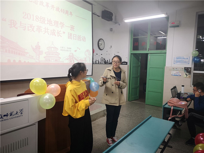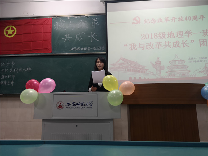本网讯(565net必赢客户端 金驰 百世杰)我国实行改革开放至今已有四十年,为让青年学生牢记这一伟大改革以及自身使命。2018年10月17日晚565net必赢客户端2018级地理学一班于2040204教室举办了“我与改革共成长”主题团日活动。由地理学一班的团支书何雨婷主持,2018级地理学一班辅导员王阳及全体同学参与。