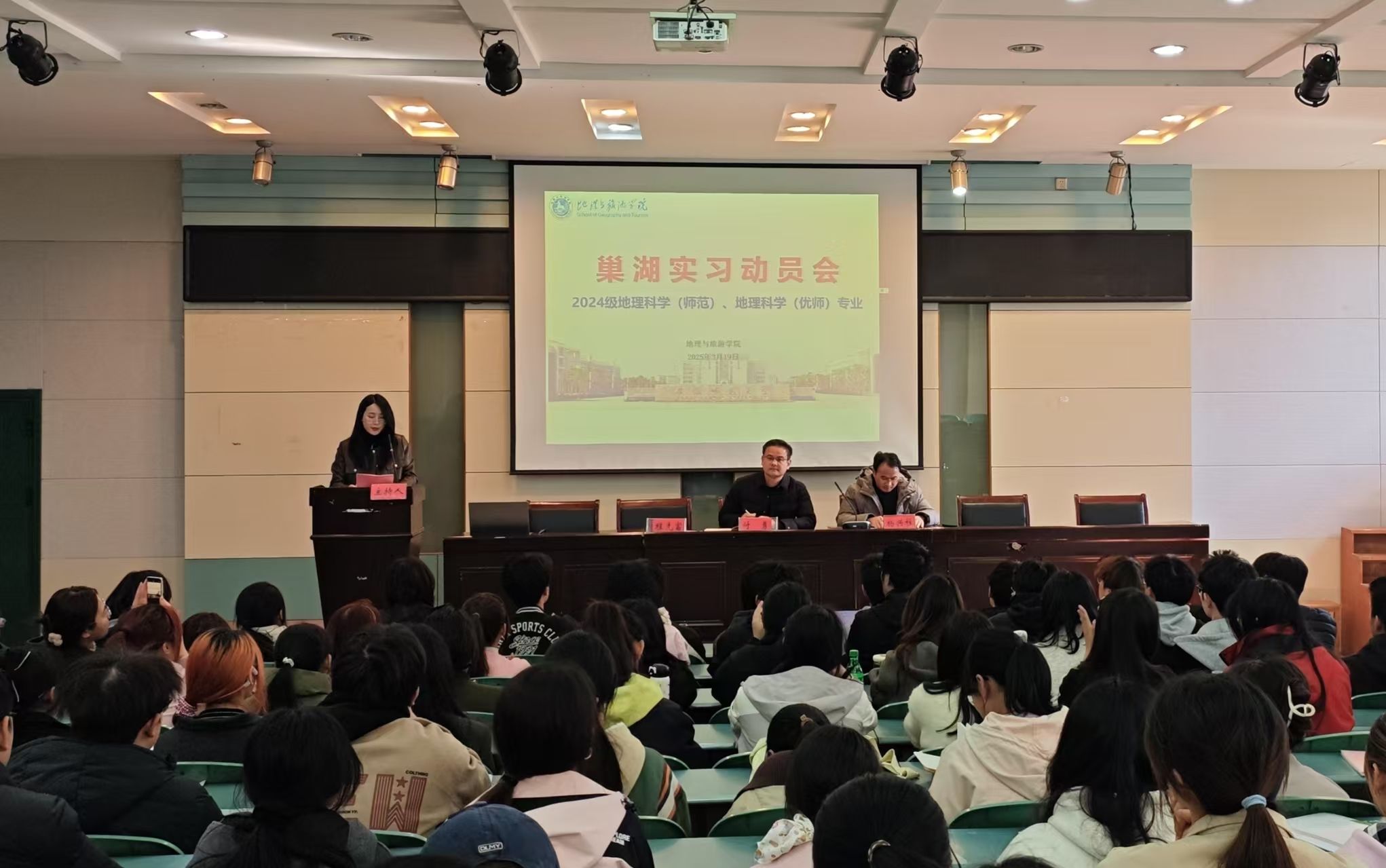 (565net必赢客户端 刘紫凤)2025年3月19日下午,565net必赢客户端召开巢湖实习动员大会,会议由辅导员彭媛媛主持,学院党委副书记付勇,副院长杨兴柱,实习指导老师程先富、杨立辉、吴立、朱晓强等出席会议,2024级地理科学(师范)、地理科学(优师)专业全体学生参加会议。