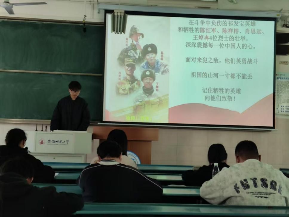 “青山埋忠骨,热血染红旗。”在“清明致敬英雄”部分,两位团支书讲述了新时代卫国戍边英雄的故事。祁发宝、陈红军、陈祥榕、肖思远、王焯冉等英雄官兵,在面对来犯之敌时,毫不退缩,用生命捍卫了祖国的领土主权。他们的英勇事迹和无私奉献精神,让同学们深受感动,现场响起阵阵热烈掌声,表达对英雄们的崇高敬意。