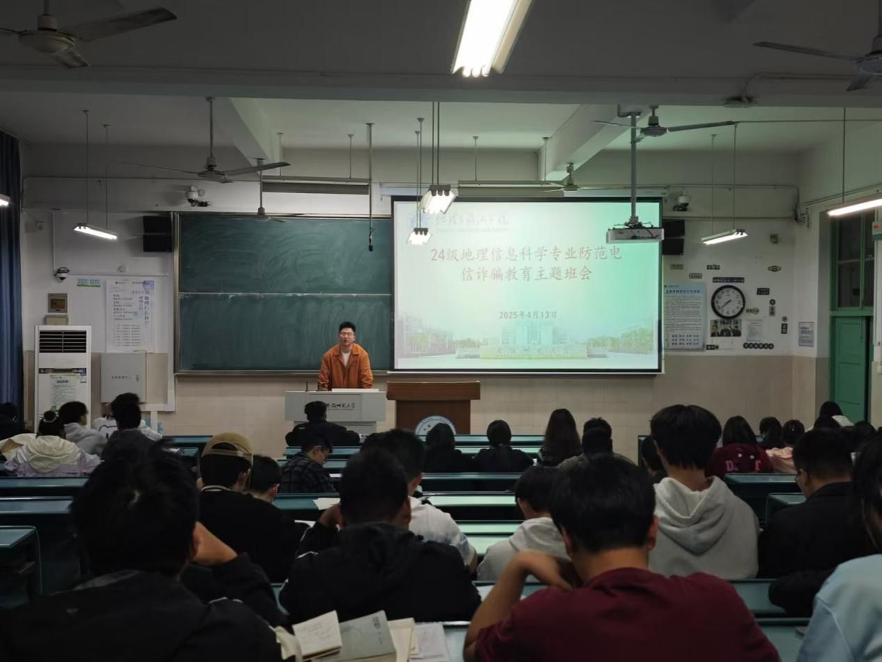 电信网络诈骗手段迭代升级,校园诈骗案件呈现高发态势。为进一步普及反诈知识,增强学生“识诈反诈”意识和能力,切实保护学生生命财产安全,预防可能存在的诈骗风险,4月13日晚,565net必赢客户端辅导员沈涵利用24级地理信息科学专业晚自习时间召开了防电诈主题班会,24级地信专业全体同学参加本次班会。