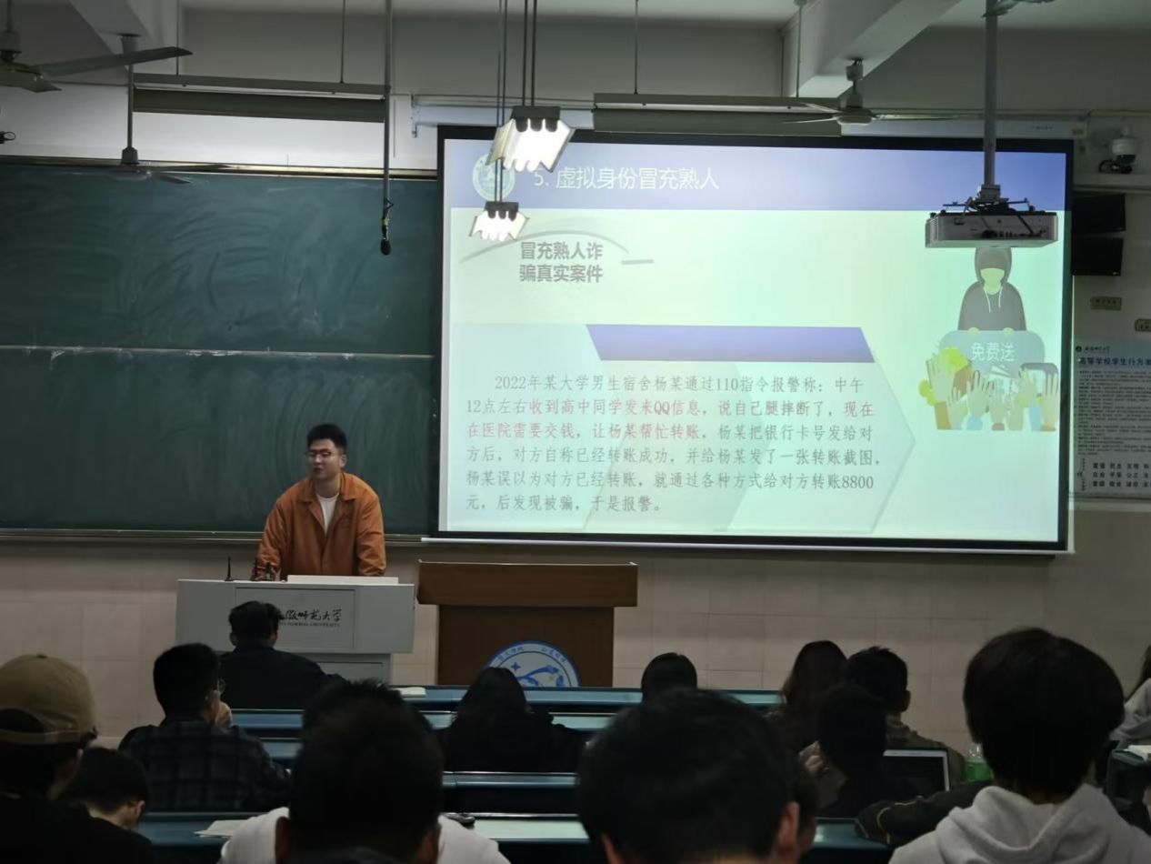目前诈骗犯罪手段类型多、变化快、隐蔽性更强,针对高发的“网络刷单”“虚拟交易类诈骗”“虚拟身份冒充熟人”等八大类诈骗手段,辅导员分门别类向同学介绍诈骗套路,通过剖析真实案例,揭示诈骗套路,并针对各类套路如何防范给出锦囊妙计,教育引导同学们不点击不明链接、不轻易加陌生微信好友、不透露个人信息、不参与诈骗活动,提高警惕,远离诈骗陷阱。