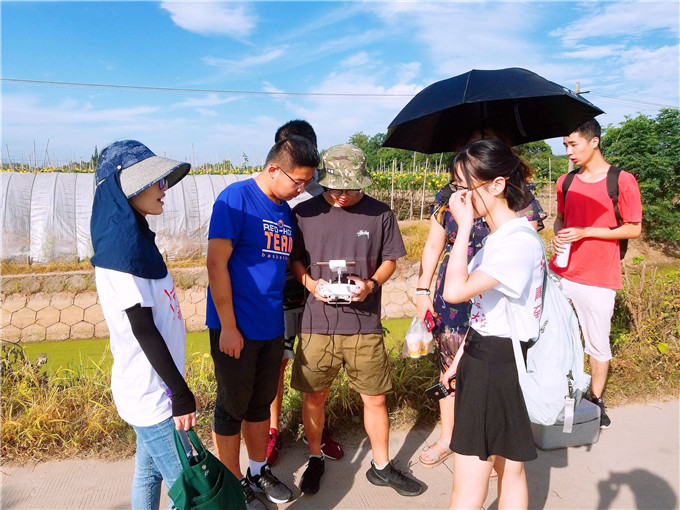 "锦甸平铺鸭绿水,白云飞动蔚蓝天"。初到田间,队员为寻找秸秆田煞费苦心,幸得村民们的热心帮助,才顺利找到大片的秸秆田。他们非常热情,不仅为团队指路,还详细介绍了村庄的情况。成员组装好无人机,随着旋翼的转动,无人机与蓝天白云融为一体。飞控员为团队拍了张"全家福",然后操纵着无人机,对地物进行取样,包括丝瓜、水稻、茭白、玉米地等。工作之余,队员们还拍摄了水田、旱地等不同类型的土壤,收获颇丰。虽然太阳越来越烈,但是队员们咬牙坚持,圆满地完成了一天的任务。