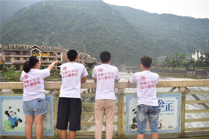 下了客车,沿着公路队员们背着行囊,徒步进入映秀镇,湍急的河水发出巨大的声响,阳光显得格外耀眼,大自然所有巍峨的元素在这里仿佛都被放大,展示它们顽强的生命力。当队员们驻足家国情怀广场,瞻仰那座神圣的主雕塑“母亲·初心”时,队里一个平时嘻嘻哈哈的男生说道“我感觉有什么东西,触动到我的心了。”位于阿坝藏族羌族自治州的映秀镇,其独特的藏族文化造就了别样的人文景观。色彩斑斓的风马旗,庄重古典的转经筒,精美绝伦的壁画,不时引得队员们的声声赞叹。
