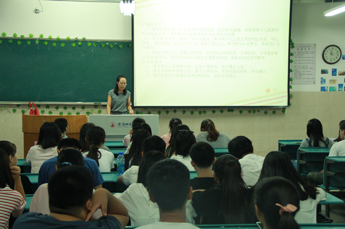 本网讯(国旅学院 文/蒋思雨 图/王竞钊)2017年9月7日晚,安徽师范大学16级土地资源管理专业在班级教室举行了欢送林文啸、陈出新两位同学携笔从戎参军入伍仪式,欢送会结束后,16级土地资源管理专业和16级城乡规划专业联合召开了新学期第一次主题班会,辅导员王雪微老师主持会议。