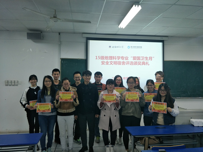 本网讯 (文/高润艺 图/王琨)今年四月是我国第29个爱国卫生月,为提高学生安全卫生意识,营造舒适健康的学习生活环境,近日,2015级地理科学专业实习辅导员张春光老师带领本专业全体学生举办了爱国卫生月主题系列活动,依次通过动员宣传、检查走访、评选总结的形式,让班级学生学习和了解卫生知识,养成文明健康的生活方式和行为。