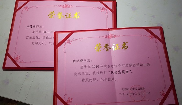 此次表彰大会在记录各个高校志愿活动的宣传片中拉开帷幕,宣传片记录了安徽师范大学、安徽工程大学、皖南医学院等高校志愿公益协会举办的各类爱心活动。接着志华爱心团队副会长洪鹏飞发表了讲话并宣布2016年度志华爱心表彰大会开始。主持人宣布优秀志愿者名单,我校爱心者协会志愿者胡舒沁、秦秋明、汪慧、姚翠、张晓晓等10名志愿者上台接受表彰,荣获“优秀志愿者”称号。大会结束后,我校爱心者协会指导老师刘冠琪及优秀志愿者与程志华老师合影留念。