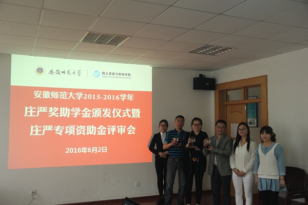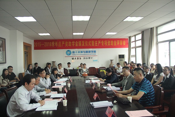 本网讯(国旅学院 吴燕/魏晓雯)6月2日下午,安徽师范大学2015-2016学年庄严奖助学金颁发仪式暨庄严专项资助金评审会在国土资源与旅游学院行政楼三楼会议室举行。庄严基金会评审委员会委员吴斌、吴军,秘书长杨晶晶,国旅学院党委书记贾冠忠、院长苏勤、党委副书记乔静、副院长赵冬梅出席本次会议,全体专兼职辅导员、奖助学金受助学生代表及专项基金申报团队参加了会议,会议由乔静主持。
