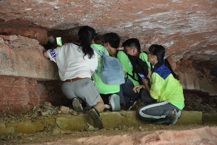 上午9点,团队来到丹霞博物馆,在艺术馆馆长的带领下参观了丹霞艺术馆,并于与队员们亲切交谈,介绍了很多关于丹霞山的文化知识。团队离开博物馆后向科考3、4号线路出发,从阳元石售票处一路向北行进,经过晒布崖,到达细美寨,攀爬陡峻的九天梯,队员们拉着铁栏杆和铁链相互扶持上山。经玄机台、风车岩,团队顺路而下,睹晒布岩风光,经过通泰桥、云门、狮子岩、混元洞,看海豹石,在混元洞内采集岩石样本,探究混元洞的形成原因。下午4点,团队回到阳元石票站,前往水上丹霞,与“水上丹霞”景点的总经理洪先生热切交谈,洪先生充当导游,随团队一起游览锦江,解说锦江两岸的景色。在喜头村下船进行的简单考察之后,团队乘船返回,结束了一天的科考行程。