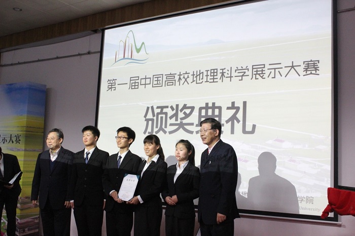 中国地理学会秘书长张国友研究员、教育部高等学校地理科学类专业教学指导委员会郑祥民教授为我校颁奖