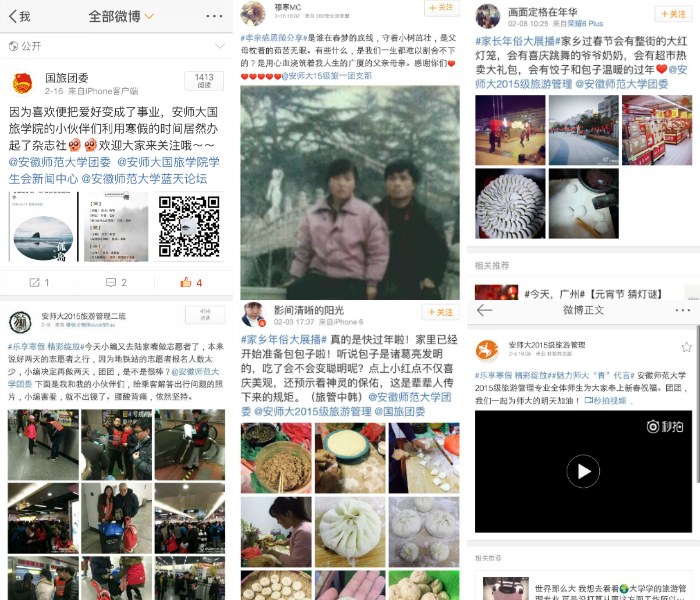 学院团委积极响应校团委《关于开展“乐享寒假 精彩绽放”主题实践活动的通知》号召,在全院各年级以班级团支部为单位组织开展“经典阅读伴成长”、“家乡年俗大展播”、“孝亲感恩微分享”、“关爱帮扶志愿行”、“魅力师大‘青’代言”等主题的实践活动,团员青年们在各支部网络社区的引领下充分参与各项活动,并通过微博等网络平台推送和展示实践成果。据统计,全院各年级团支部共推送微博287条,总浏览量216891次,其中点赞1369次,评论310次,转发254次。团员青年在线下线上的联动中充分实现自我教育。