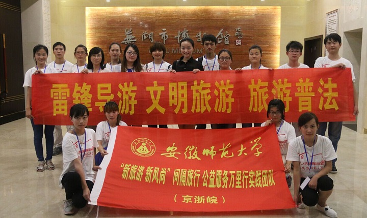 据悉,安徽师范大学“新旅游 新风尚”赴京浙皖等地间隔旅行公益服务万里行实践团队作为一支校级重点团队,围绕旅游管理专业特点和优势,依托国家级管理学校外实践基地,打造雷锋导游、文明旅游、旅游普法和间隔旅行等四大主题,奔赴三省十市的爱国主义教育基地、著名风景区和五星级酒店开展志愿服务实践活动。实践队员们将专业知识与实践技能相结合,用无悔青春和辛勤汗水投身于社会公益,充分发挥第三课堂的育人作用,为促进文明社会、和谐社会做出积极的贡献。