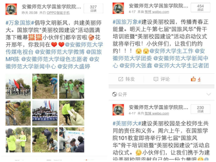 在2013年全国第34个植树节到来之际,国旅学子在学校部门的大力支持下,在花津河畔栽种下三百余棵常绿弥香的丹桂树,向85周年校庆献礼。两年来,学院认真按照“分区负责、全程养护、师生相传、树木育人”的要求,积极落实“丹桂园”日常养护管理工作。学院决定自本学期起,在学院党校、团校、学生骨干培训班和新生入学教育、毕业生文明离校教育中增设“美丽师大建设”活动内容,以“共建接力”形式深化丰富实践育人理念。