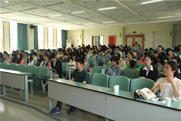 伴随着热烈的掌声,年逾花甲的杨克贵老师走上主讲台。杨老师引用了毛主席为陶先生的一句题词—伟大的人民教育家开场,详细的介绍了陶行知先生的童年、成长、求学、求知等人生重要阶段。重点介绍了陶行知先生在创办学校、启发民智、宣传先进教育理论等方面为近现代中国教育事业所做出的突出贡献。接下来,谈及陶行知与我校的渊源时,杨老师饱含深情地说到:“我校的前身是省立安徽大学,而陶行知先生正是省立安徽大学的创办人之一。在先生离开省立安大后,仍然关心学校的发展,为完善学校各项政策、提高办学水平建言献策。”最后,杨老师慷慨激昂的向同学们呼吁:学习陶行知先生“不为名,不为利”的服务精神;学习他教人求真的育人理念,谨记“千教万教教人求真、千学万学学做真人。”