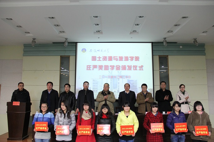 据悉,安徽师范大学庄严奖、助学金自2008年起由安徽芜湖庄严基金会捐资设立,旨在通过奖励和资助的方式,帮助贫困大学生解决学习、生活上的困难,使他们能够励志成才,顺利完成学业。成立至今6年的时间里,庄严奖、助学金累计资助金额达75万元,资助同学810人次,为诸多大学生缓解了生活、学习问题,是国旅学院募集社会化助学基金中设立时间最长、奖助金额最大、覆盖面最广的一项奖助学金。