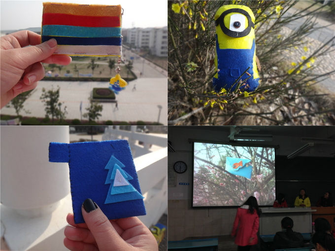 此次女生节的庆祝活动,由班里全体男生及女生班委共同准备。为了给女生们惊喜,要求男生每人制作若干件手工制品——材料是不织布和针线。从未做过针线活的他们克服了重重“挑战”,最终呈现在眼前的,是精美的布制小黄人、阿狸,实用的卡包、小钱包……